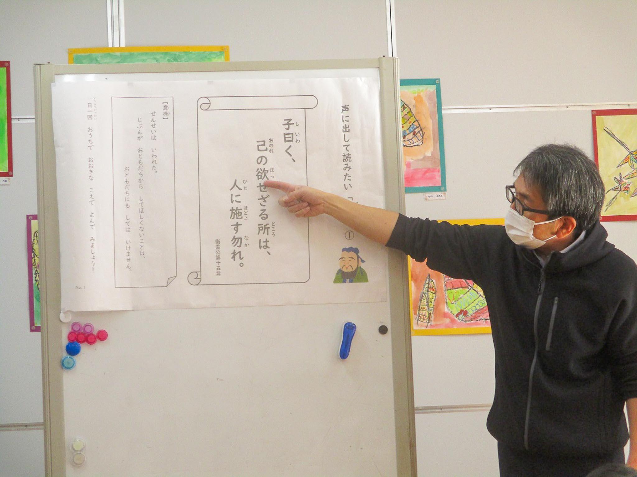 子ども達は、毎日漢詩を素読して言葉のリズム感に親しんでいますが、孔子の論語は、詳しい意味についても、教えてもらいながら素読を行いました。