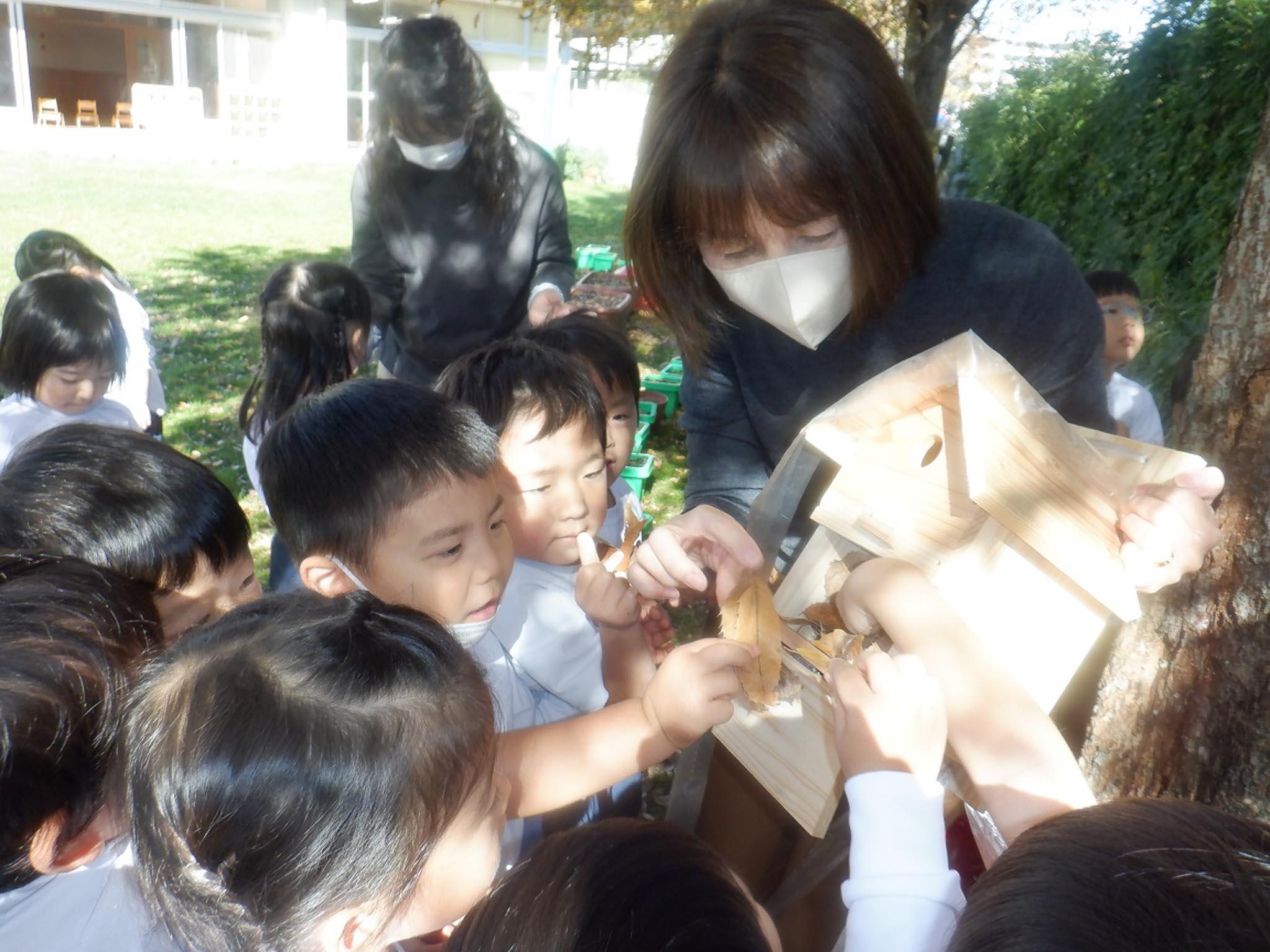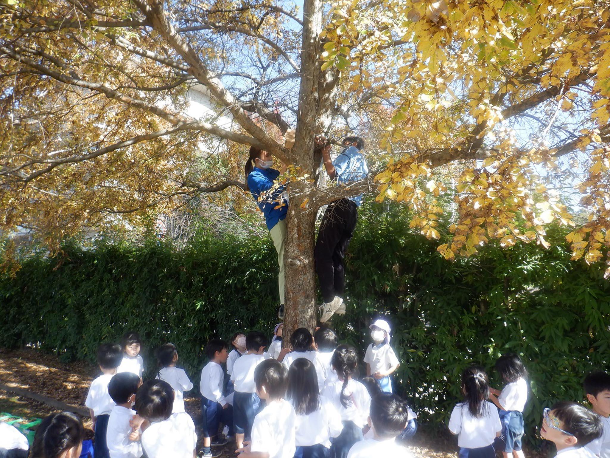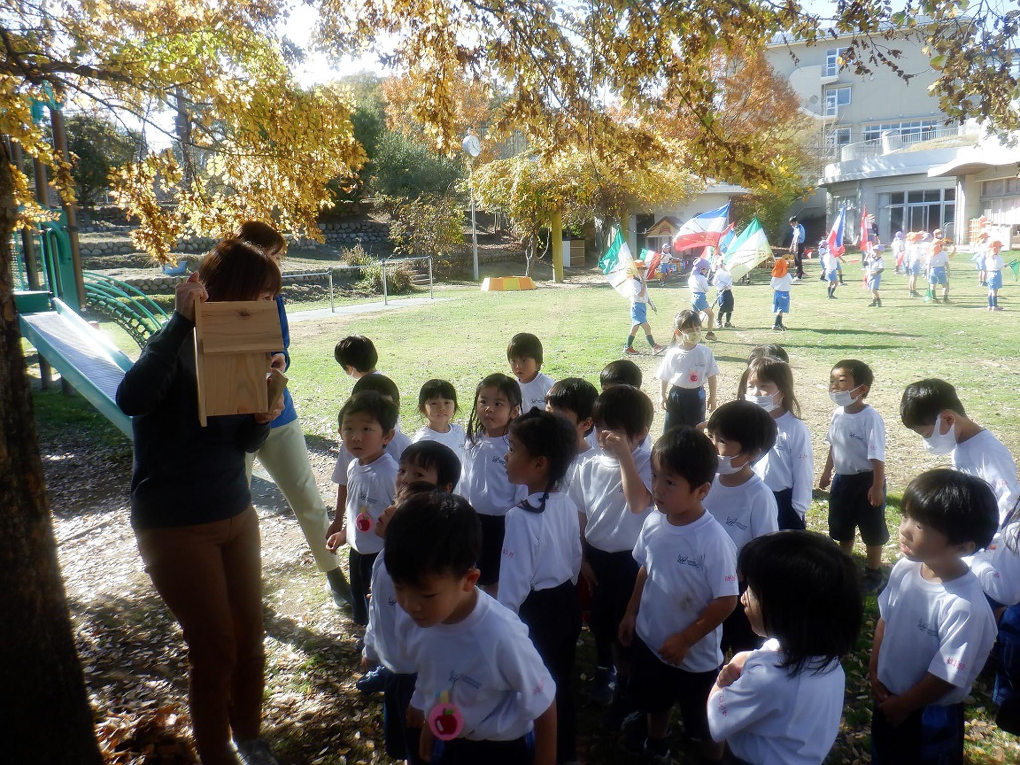 以前から用意していた、巣箱を持ってきて、「じゃあ~この樹に巣箱を取り付けて、小鳥さんのおうちにしてもらおう」ということになり、高い所まで、先生に登ってもらって巣箱を取り付けました。