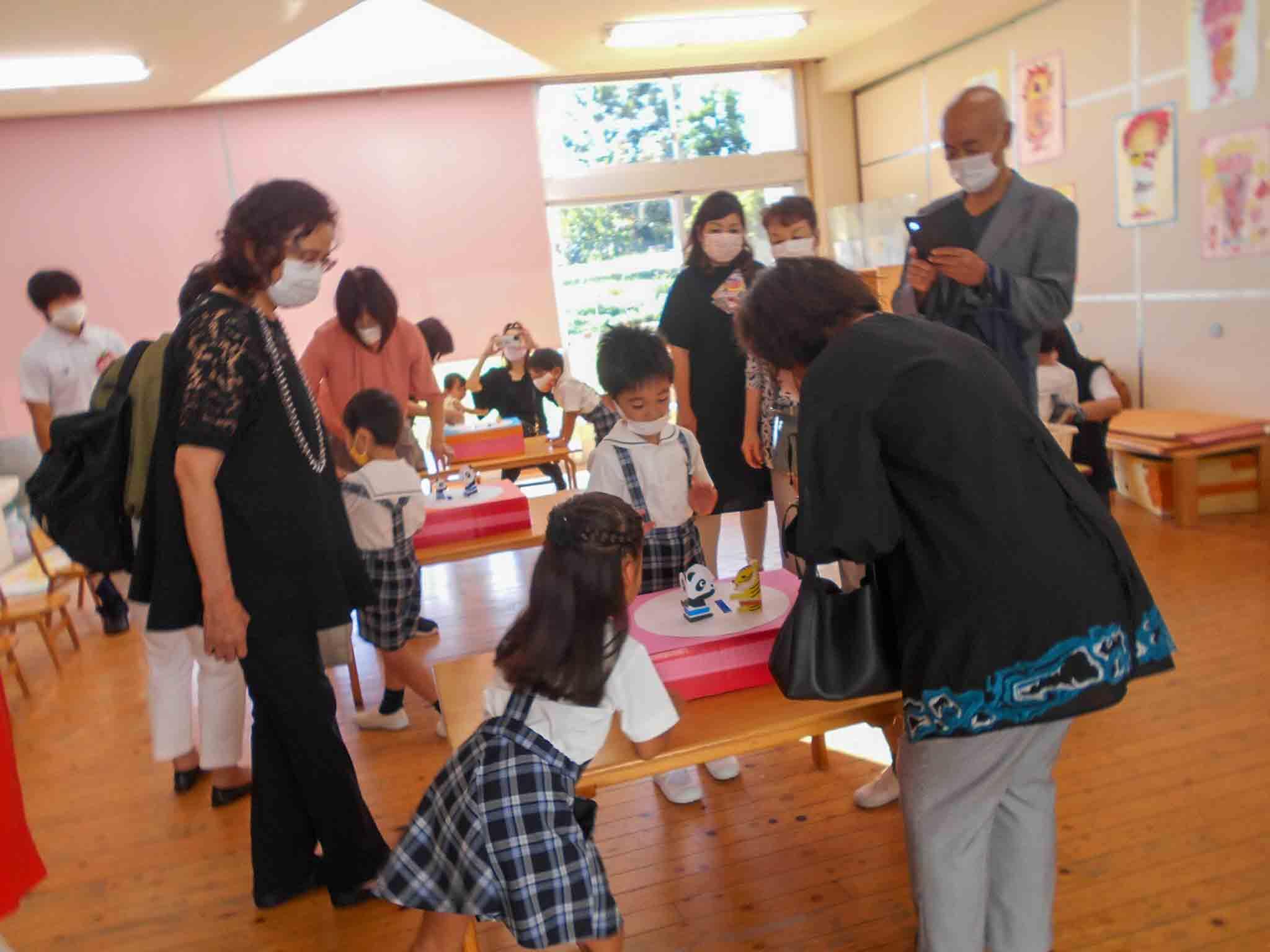 敬老の日の参観を行いました。昔遊びのコーナーをおじいちゃんおばあちゃんと楽しみました。可愛いお孫さんとの大切にな時間に、園内が温かく包まれました。