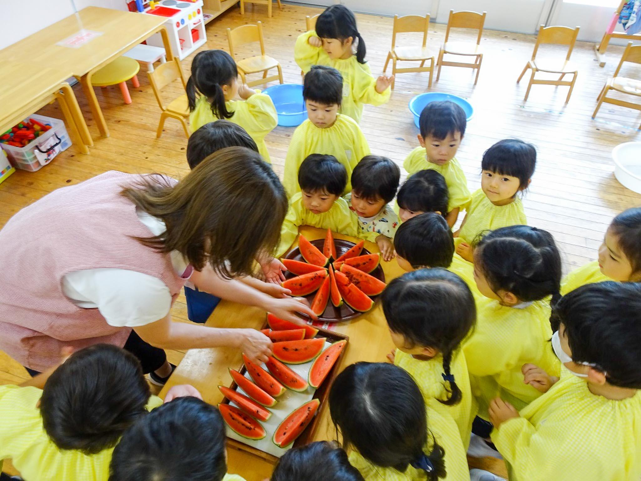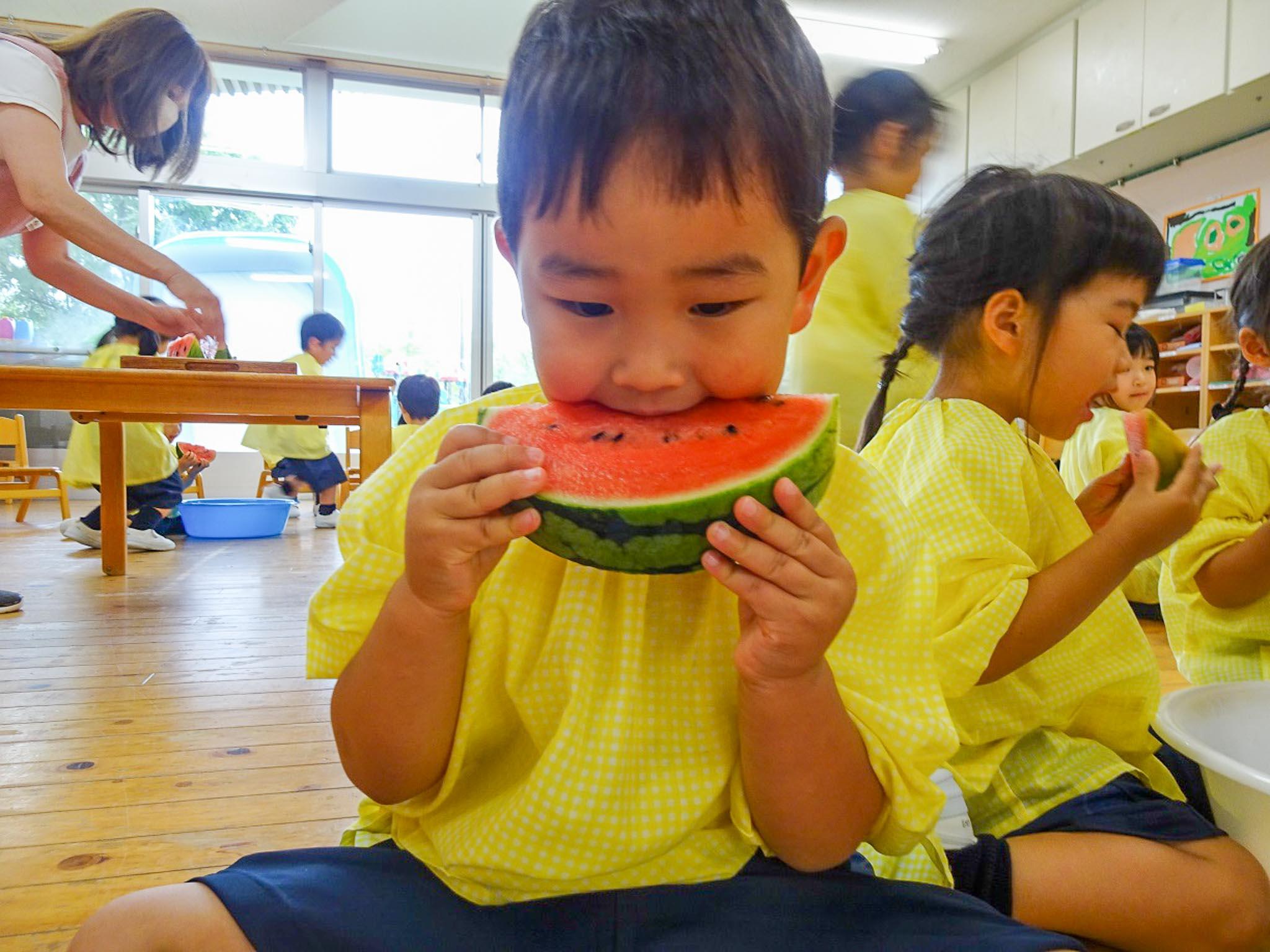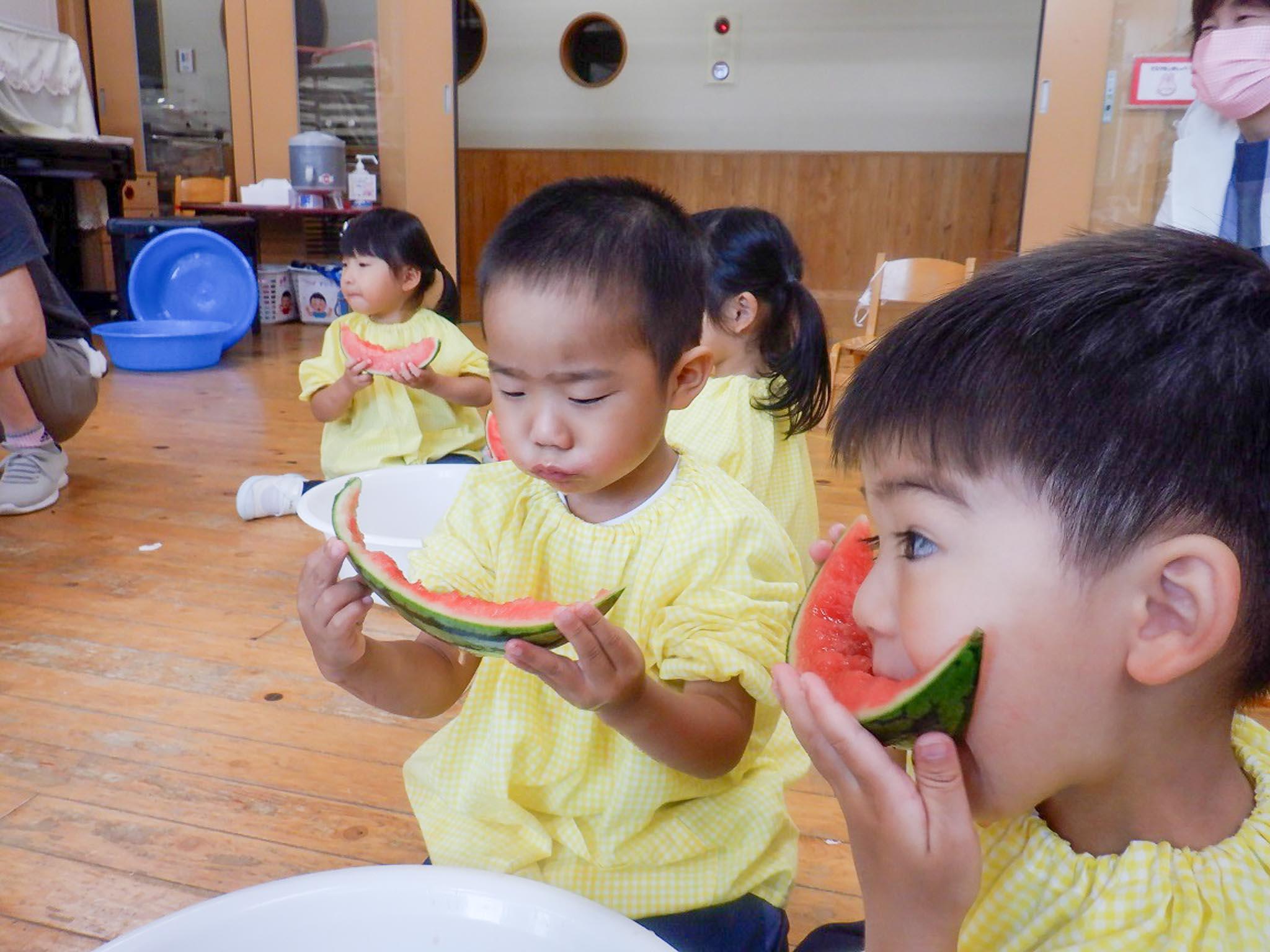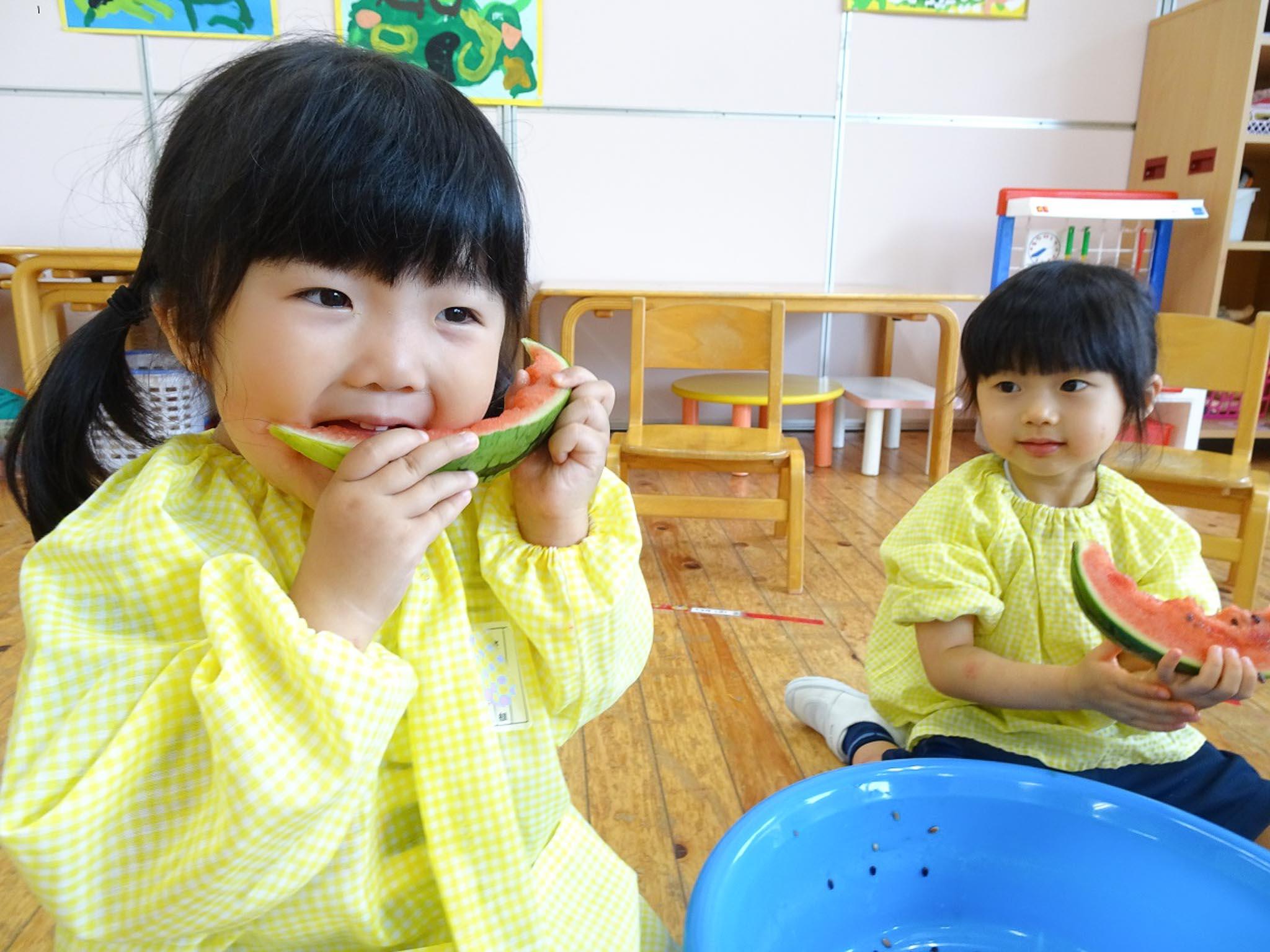 たぶん、おうちでは子ども達に食べやすいようにカットしておられるかもしれませんが、スイカと言えば、こんな風に食べたいね、と大きな口を開けてかぶりつく姿が可愛かったです。種の出し方も上手に出来ていました。