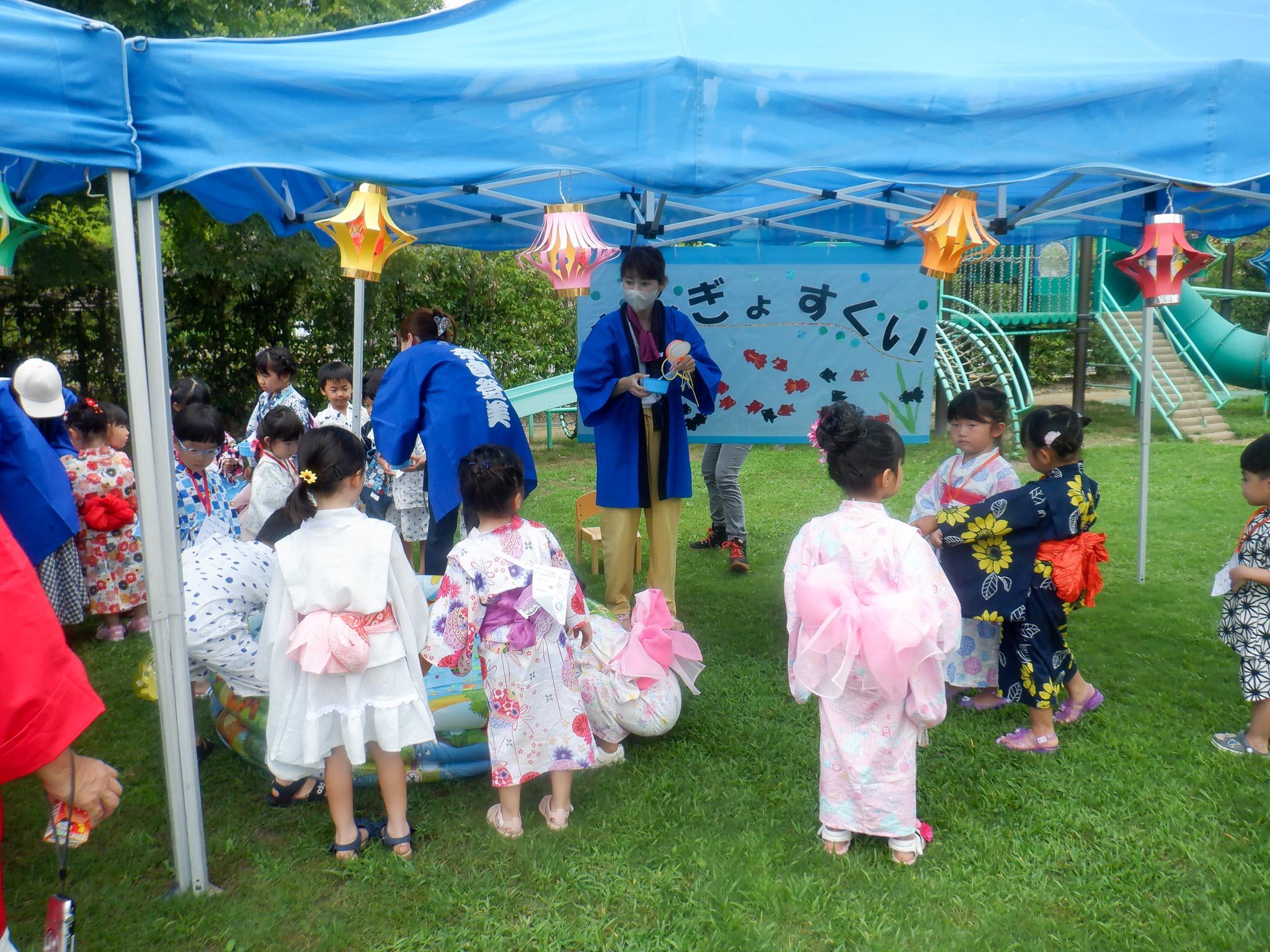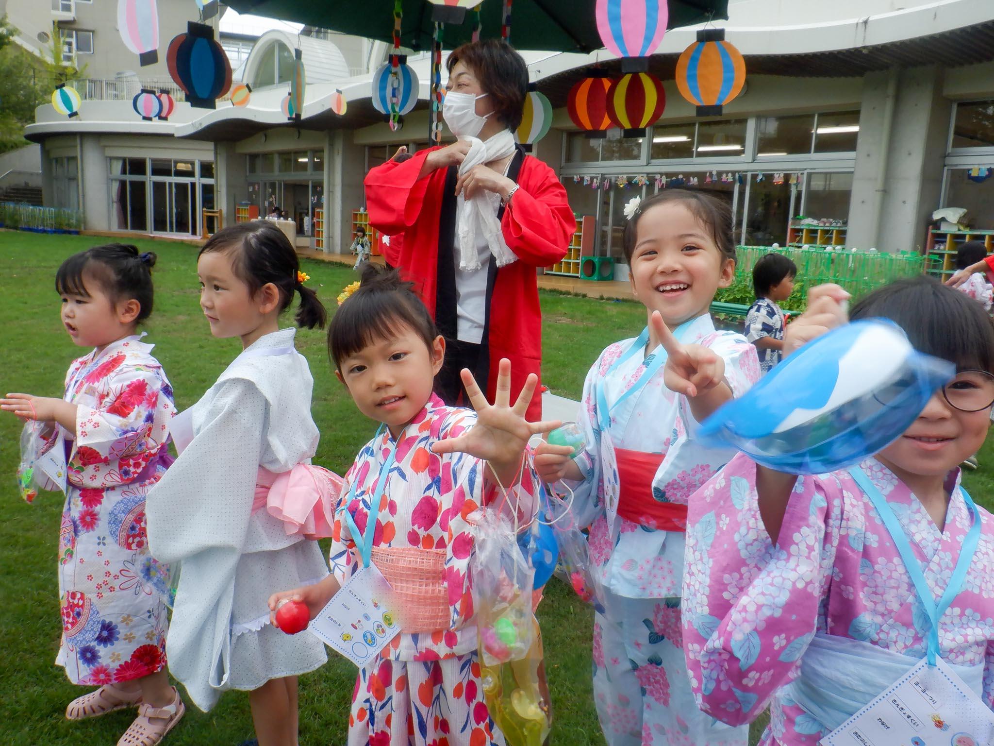 子ども達は、それぞれに思い思いの夏祭りの衣裳を着て、ワクワクしながら登園して来ました。