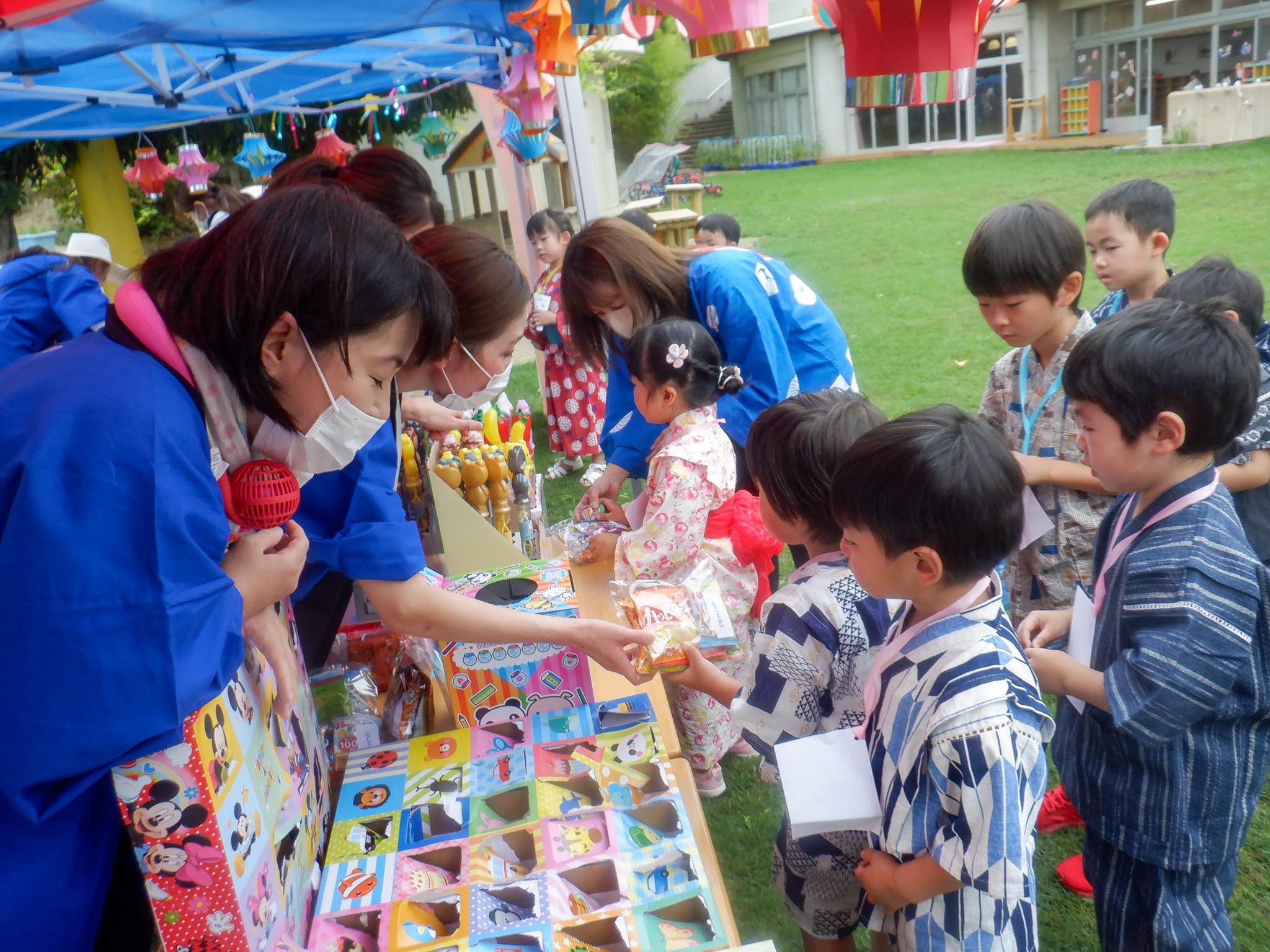 夏祭りをしました。保護者の方と一緒に行う夕涼み会は出来なくなったのですが、役員の皆様にお手伝いしていただいて、子ども達のお楽しみ会として行うことが出来ました。