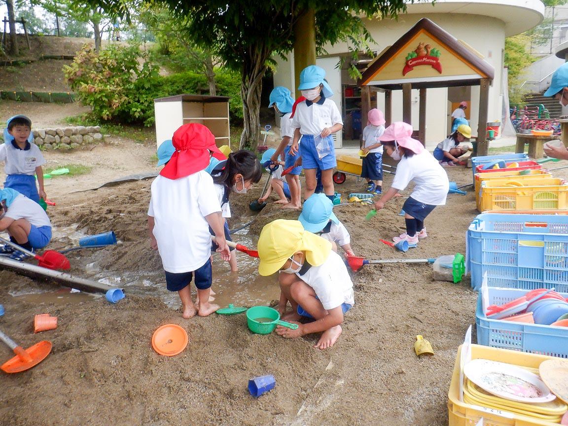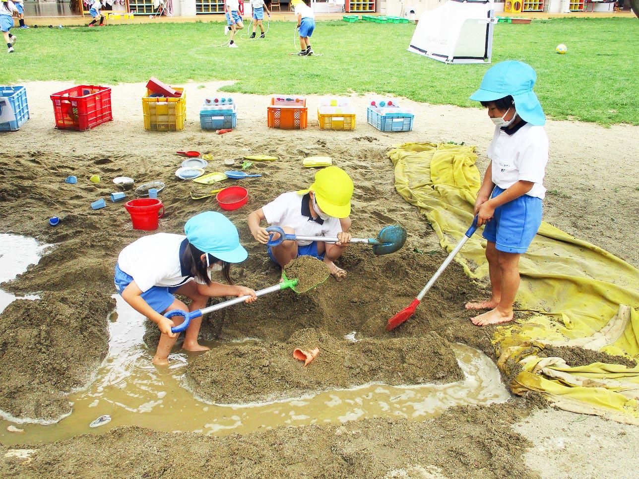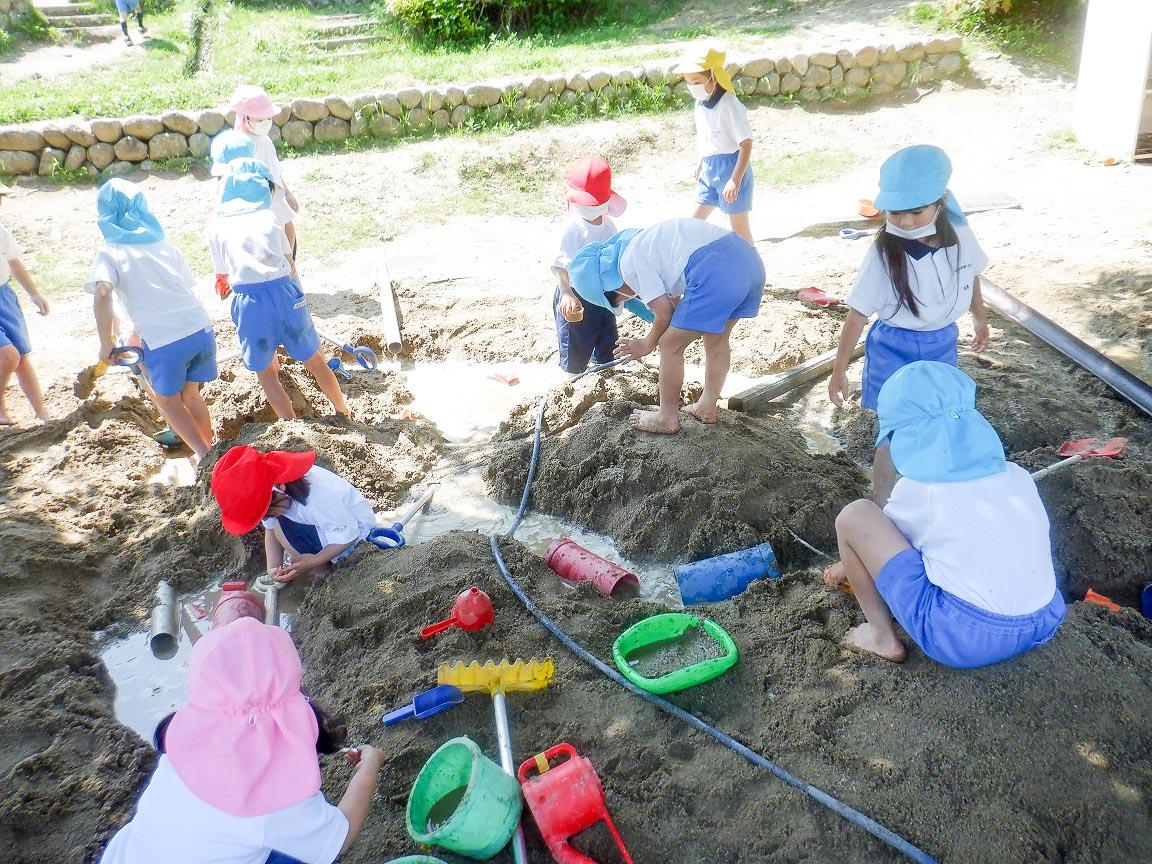 むしむし暑い日は、裸足になって山を作ったり川に水を流したり、池や海まで出来ていきます。年長組の子ども達は大胆に水を流すうちにどんな風にしたら水が流れやすいのか、考えながら遊びます。