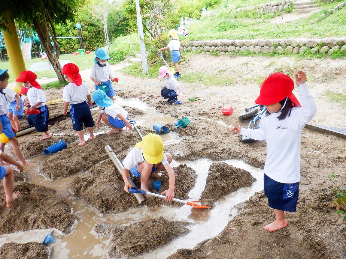 年少組の子ども達は年長児の遊びを観て恐る恐る水の中へ。「冷たくて気持ちいい!」「こっちから流して~」「もっと掘って深くしよう」「うわぁ~足が池に埋もれていく~」「もっと水をくんできて~」「凄い繋がってきた~」と会話が弾みます。年少組の子どもも「楽しいなあ~」とおおはしゃぎです。感触遊びにもなっています。