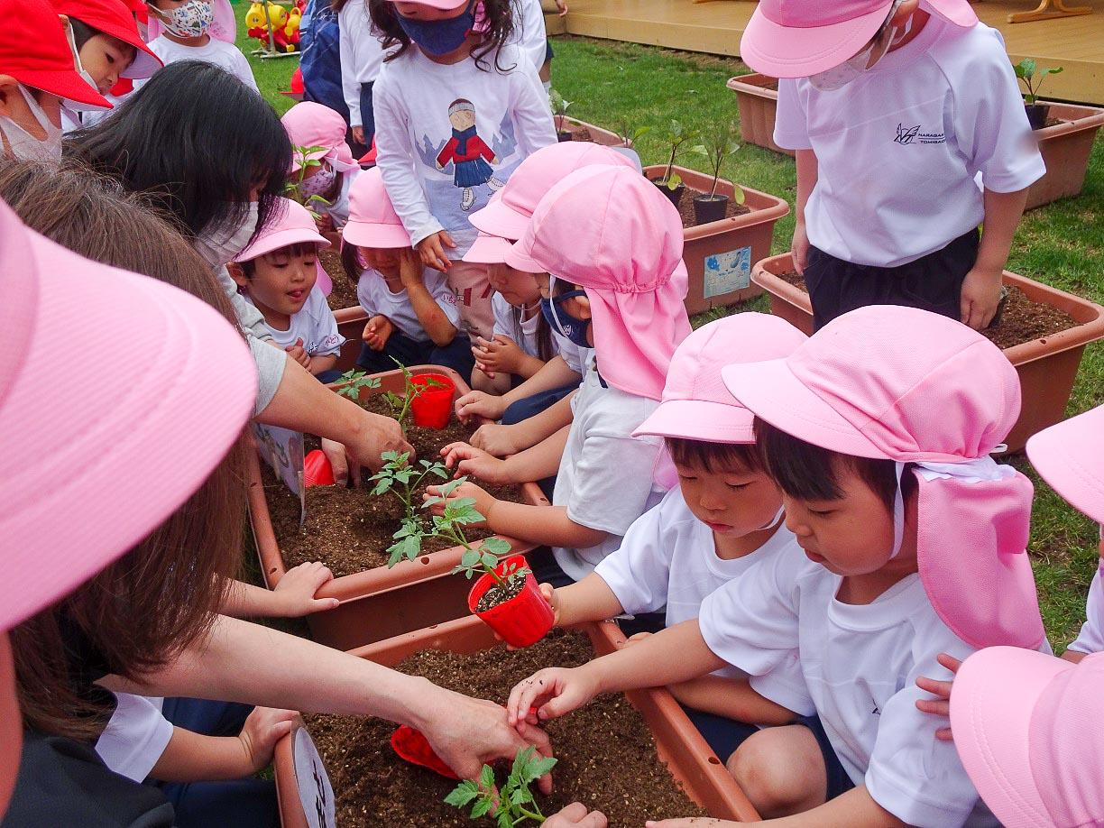 年少組の子ども達が、夏野菜を植えました。もうすぐ、梅雨がやって来ますから、5月の晴れ間を見て、茄子・キュウリ・ピーマン・トマトの苗を植えました。