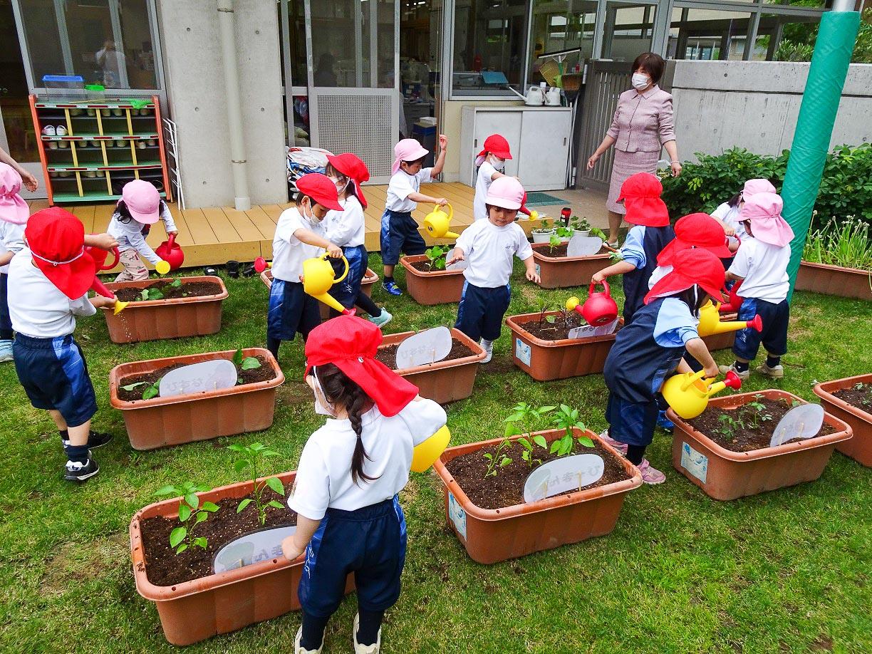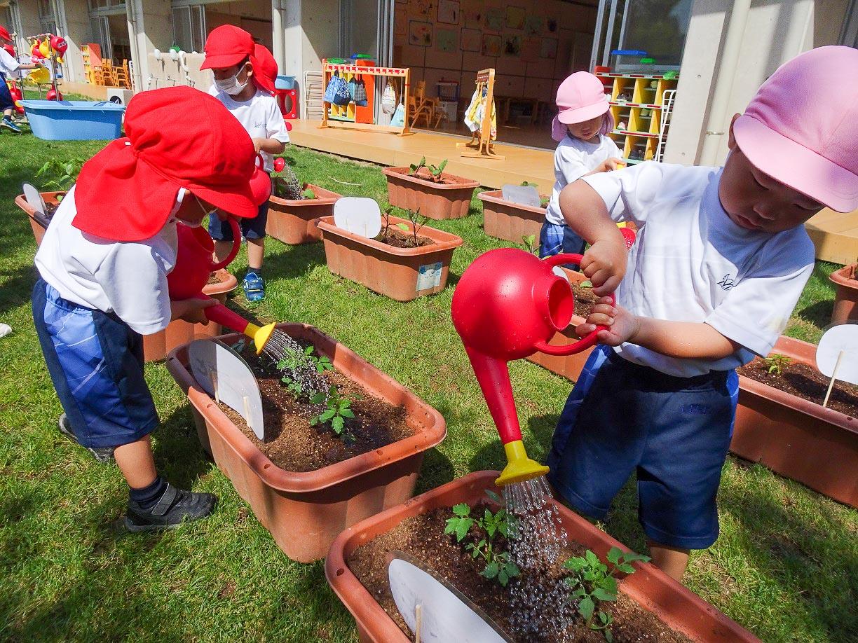 植えた後は、皆で可愛いジョロを持ってきてお水やりです。初めての経験の子どももいますが、お水やりは楽しそうです。