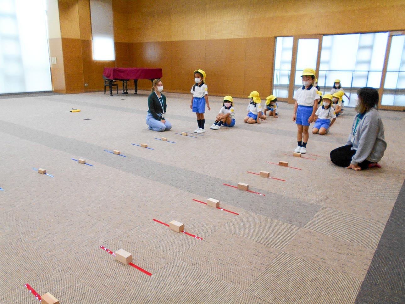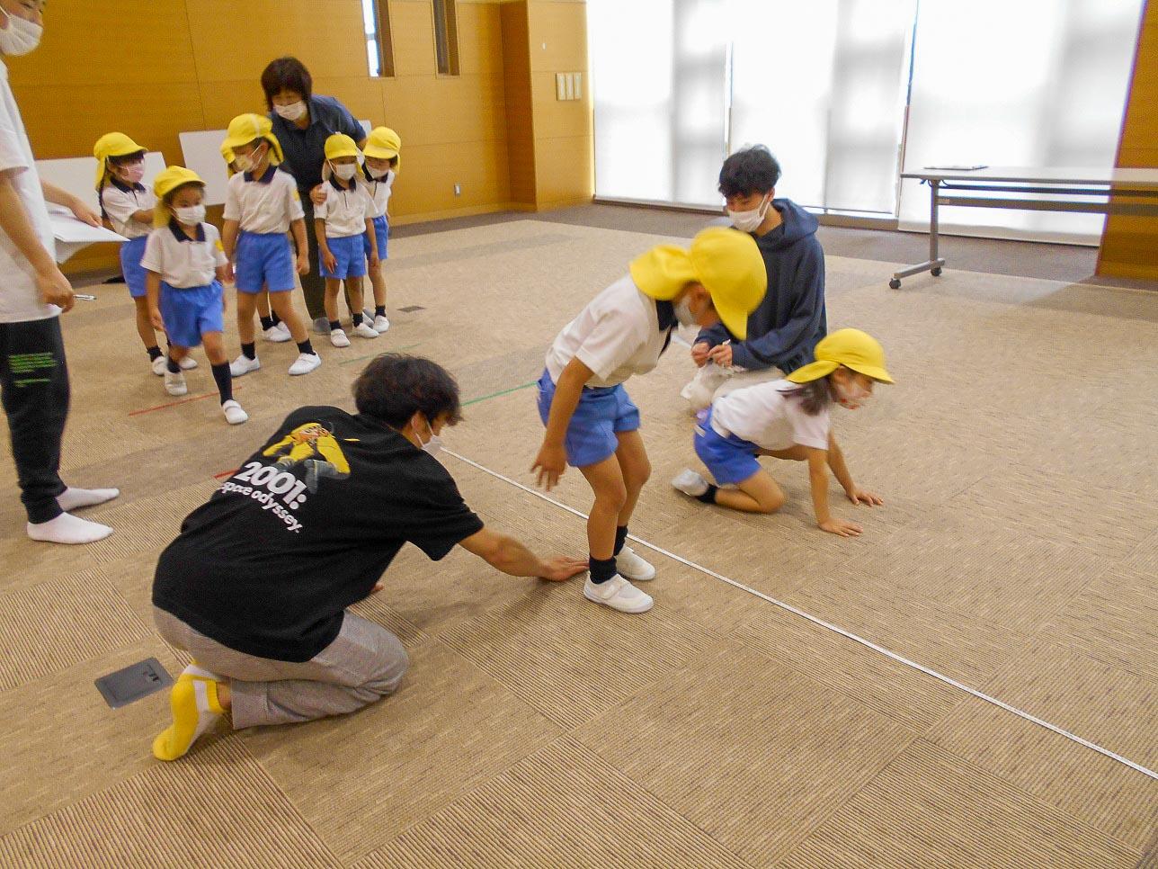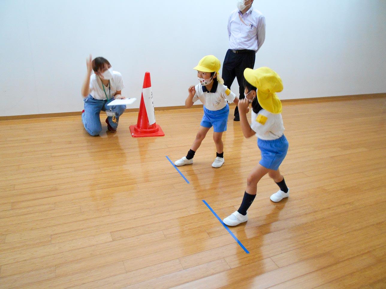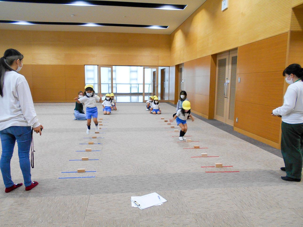 25メートル走・ソフトボール投げ・立ち幅跳び・連続飛び越しの四つの競技ですが、どれも大学生のお兄さんお姉さんが優しく正確に測定して下さいました。どの子にも「お~頑張ってるなあ~」「速い速い」「さっきより遠くまで跳べたよ~」など応援の言葉をかけてもらい意欲的に取り組めました。