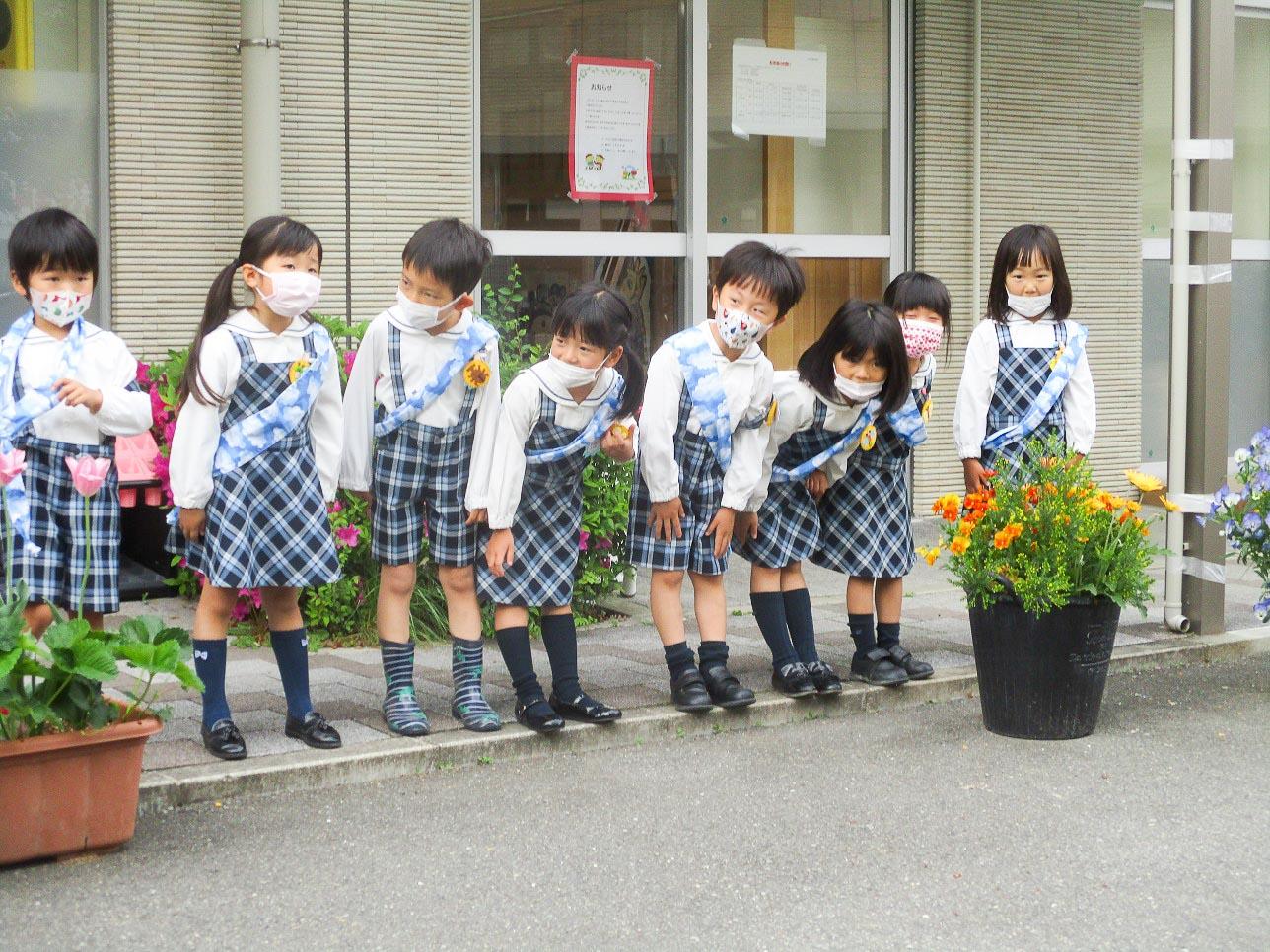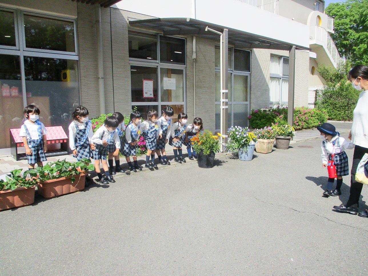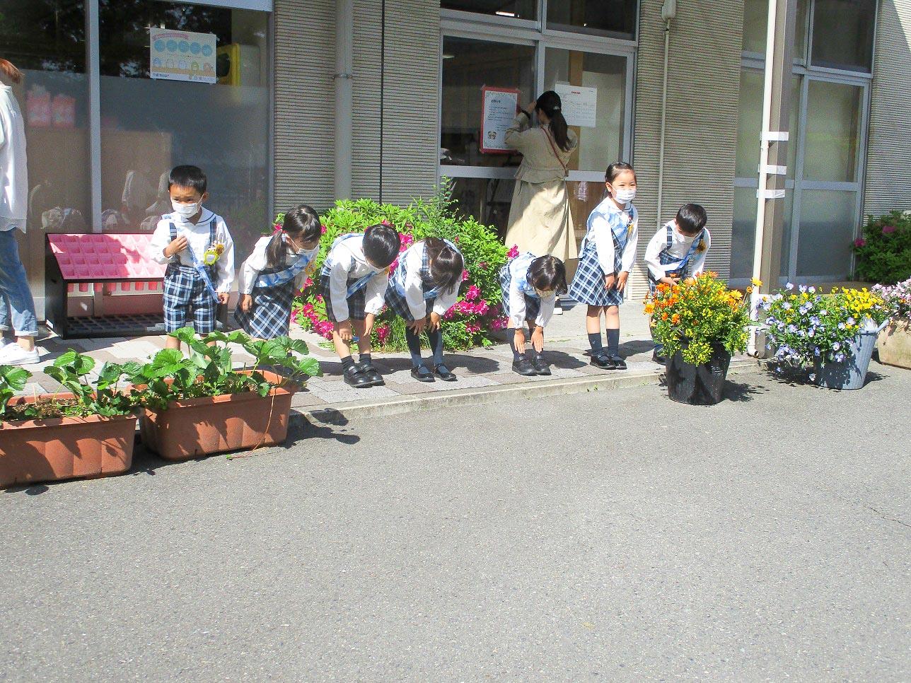 前日に当番ワッペンを付けて帰り「明日は、おはよう当番だよ」とおうちの人に伝えている姿も有り、当番の朝には、早く来てスタンバイしています。朝からとても意欲的な姿が有り、こんな毎日の体験から年長として少しずつステップアップしていくのだと思います。年中組・年少組の子達は、何々?・・・という表情でしたが、毎日挨拶している間に初めは習慣から、段々「挨拶したら気持ちいい」という感覚を覚えてくれたらと思います。
