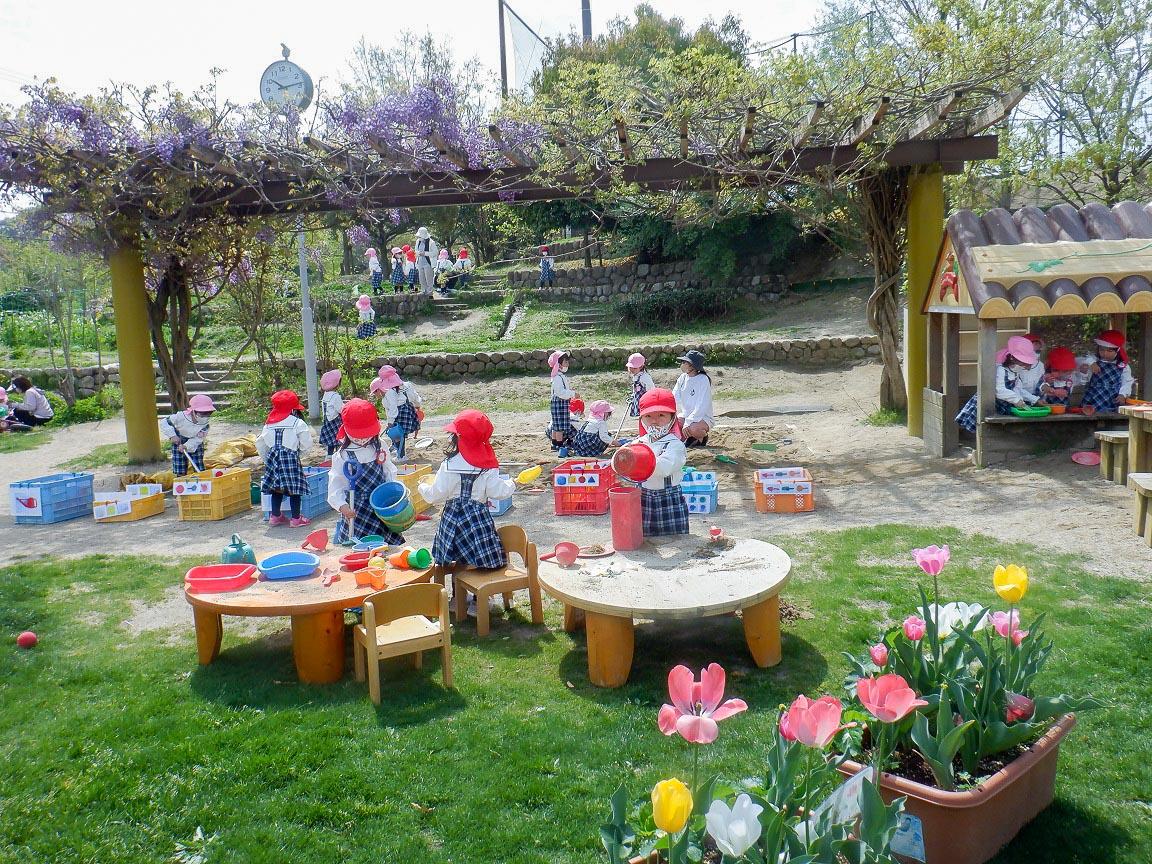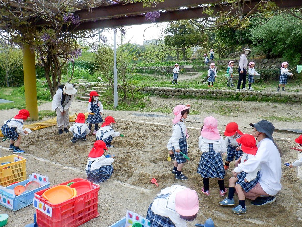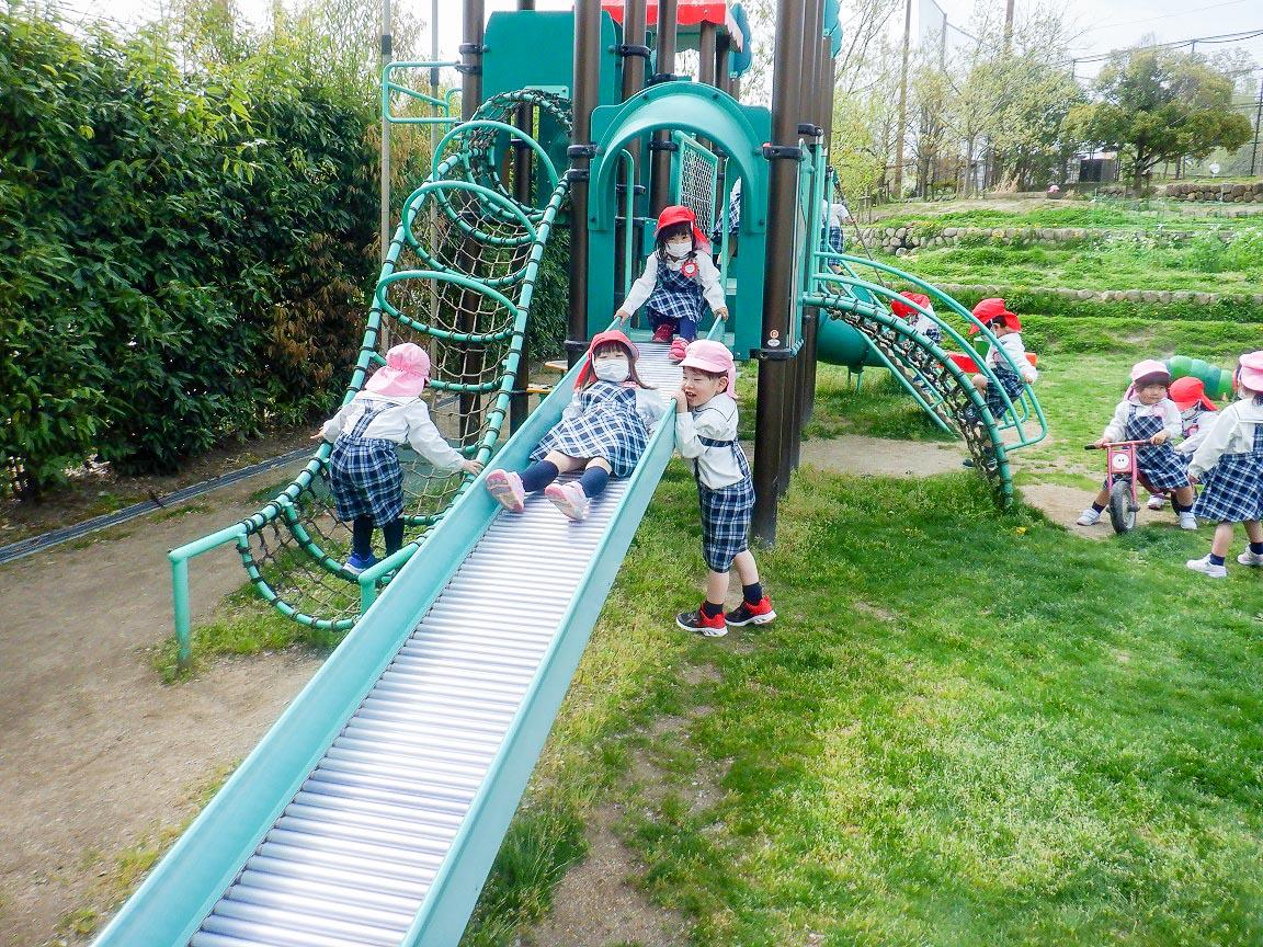 年少組だけで園庭で遊びました。みんな外遊びが大好きです。総合遊具に登ったり、砂場で遊んだり、棚田に登ったり、大きい組さんのようにサッカーをしてみたり、どこでも好きなところへ駆け出します。集中して一つの遊びをする子とあちこちどんな遊びがあるか探検する子と様々な姿がありますが、とにかくとても楽しそうです。