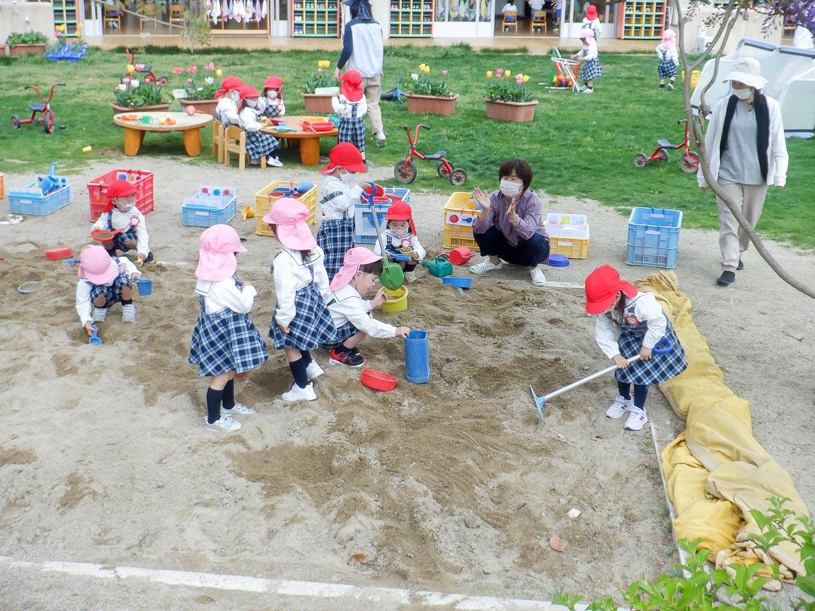 年少組も思う存分遊びたいので、給食の無い4月は、体操服登園にしました。給食が始まったらゆっくりお着替えをしますので、おうちでも一人で出来ることが増えたら嬉しいです。子ども達も少しずつ出来ることが増えていくと、幼稚園での生活が意欲的になると思います。ゆっくりでいいので生活習慣も身につけていきましょうね。