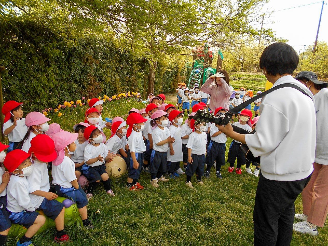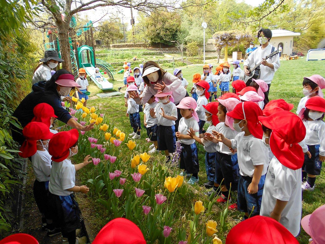 お庭でいっぱい遊んだ後片付けてお部屋に入る前に、チューリップのお花の前に集合してチューリップの手遊びが始まりました。