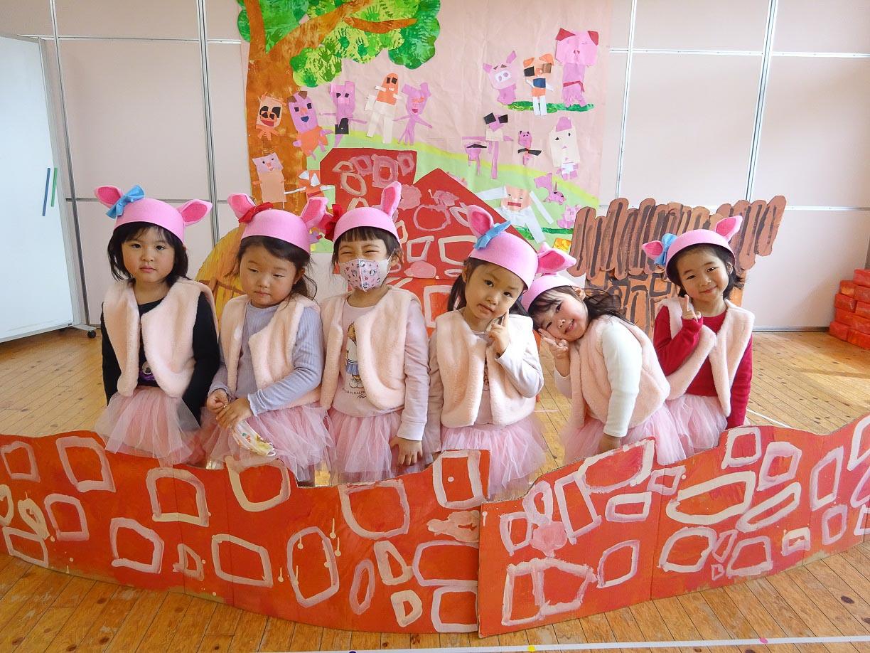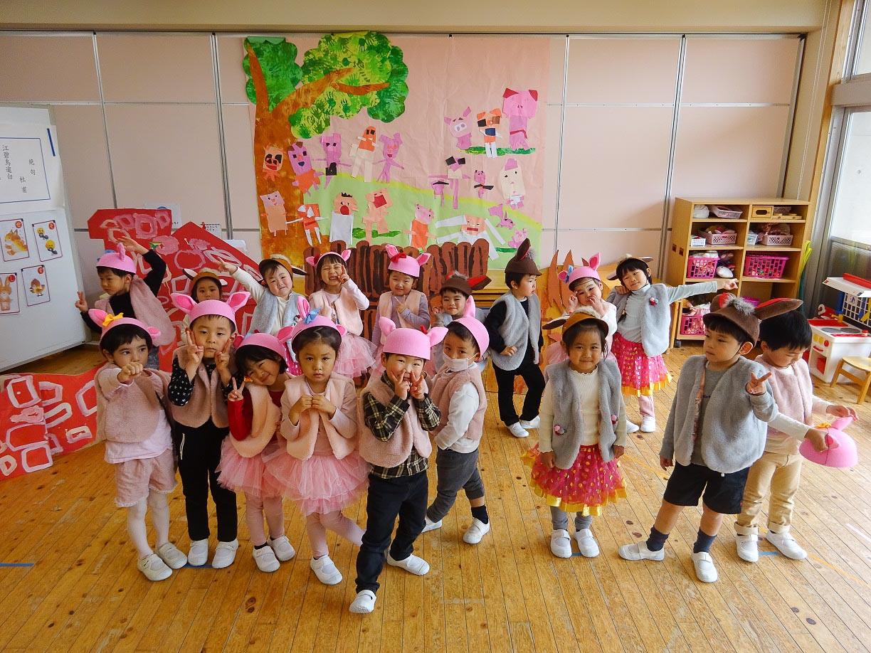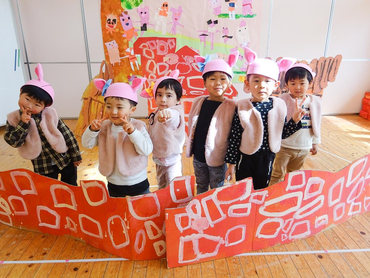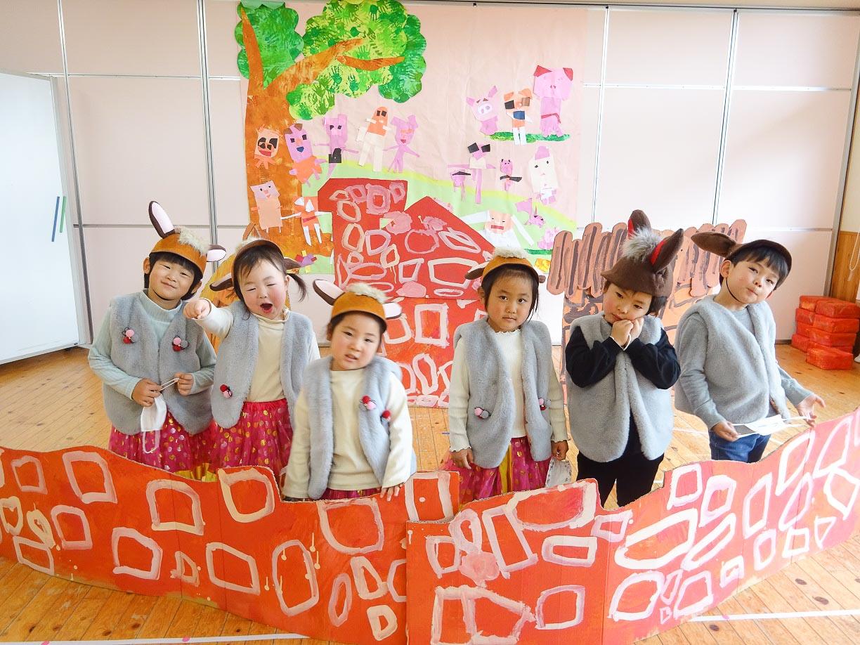 年少桜組のお話は「三匹の子豚」です。役割を決めるときに、木の家を作る中豚ちゃんになりたい子がいなかったので、木のおうちには誰も住んでいませんでした。それがまた、面白い!レンガのおうちを作る子豚ちゃんは、人気で多すぎて、レンガのおうちも大きな大きなおうちになりました。子ども達は、三匹の子豚の歌が大好きで、毎日楽しそうな歌が、お部屋から聞こえてきます。