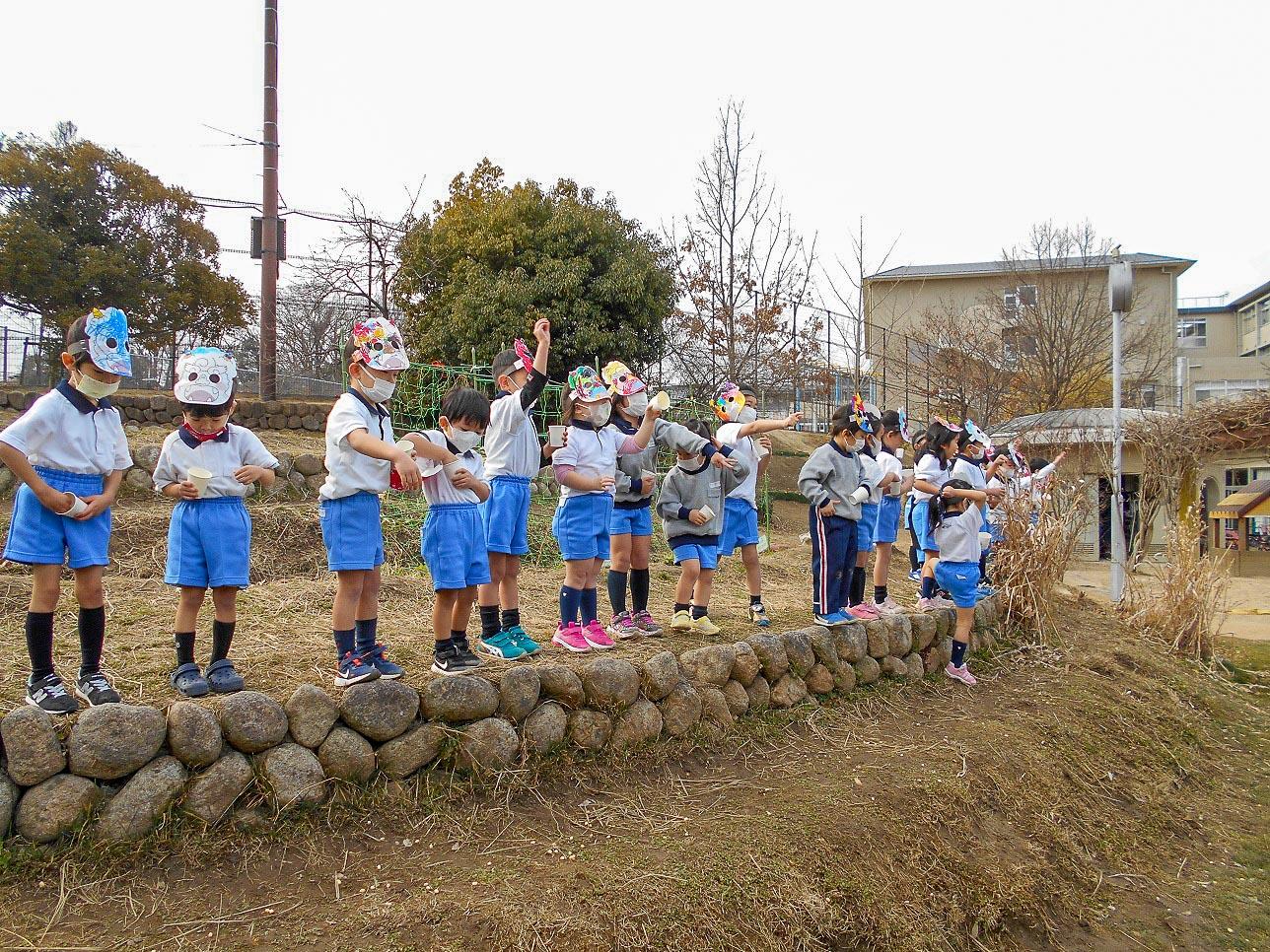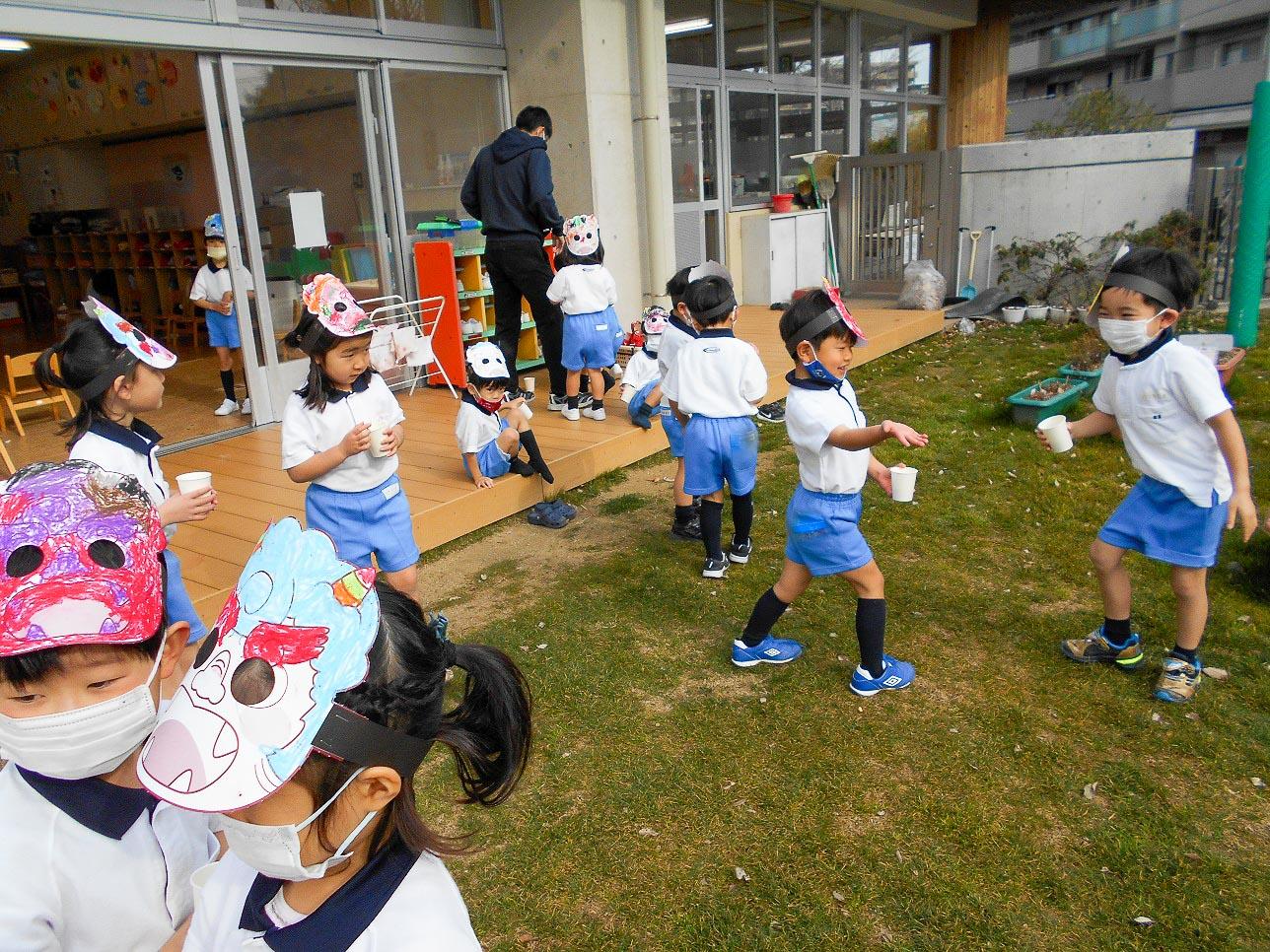 幼稚園にいるかもしれない見えない鬼や自分達の心の中の弱虫鬼・怒りんぼ鬼・泣き虫鬼・など様々な鬼をやっつけようと一生懸命です。