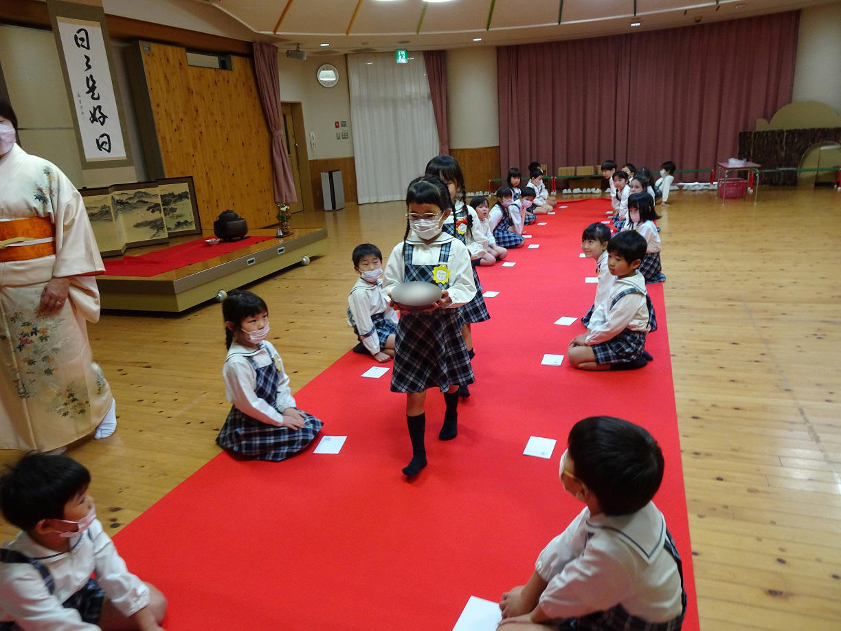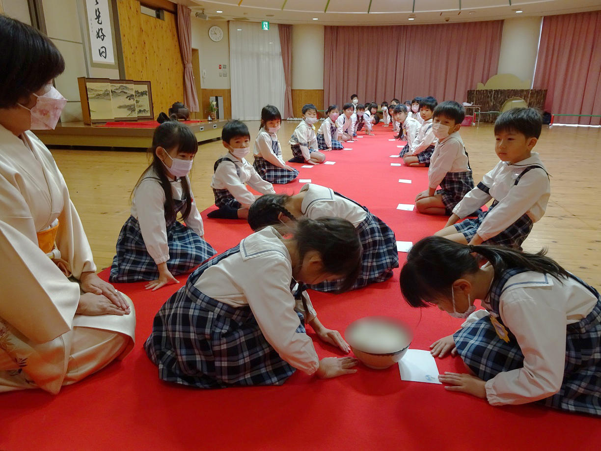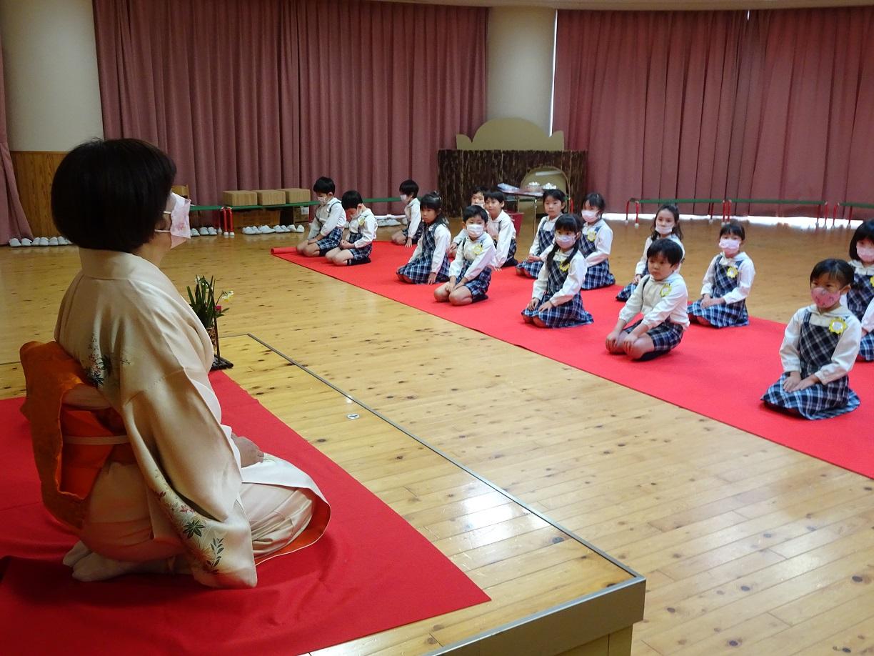 今年度初めて遊戯室で礼法を行いました。例年年長になると作法室で礼法を行うのですが、コロナ禍で、行えずにいました。遊戯室の広い空間で和室の雰囲気を出せる環境を整えて行うことにしたところ、子どもたちは、正座を上手にして背筋も伸ばすことが出来ました。