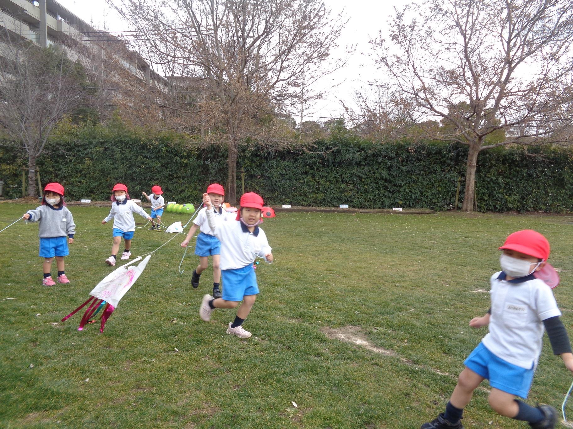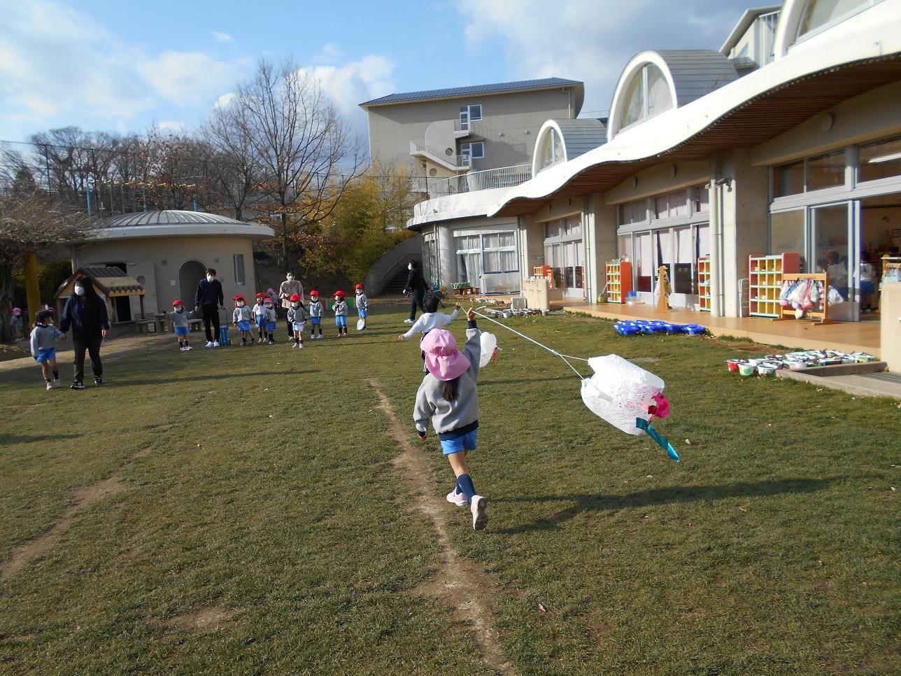 自分で作った凧がすぐに飛ばせられたので、寒い北風もなんのその。小さな手を一生懸命挙げて走ります。走っているとビニール凧に風の抵抗を受けてふわふわ浮かびます。後ろを向かないと浮いているのが確認出来ませんが、風の抵抗が自分の手に伝わってくるので、一生懸命駆けます。
