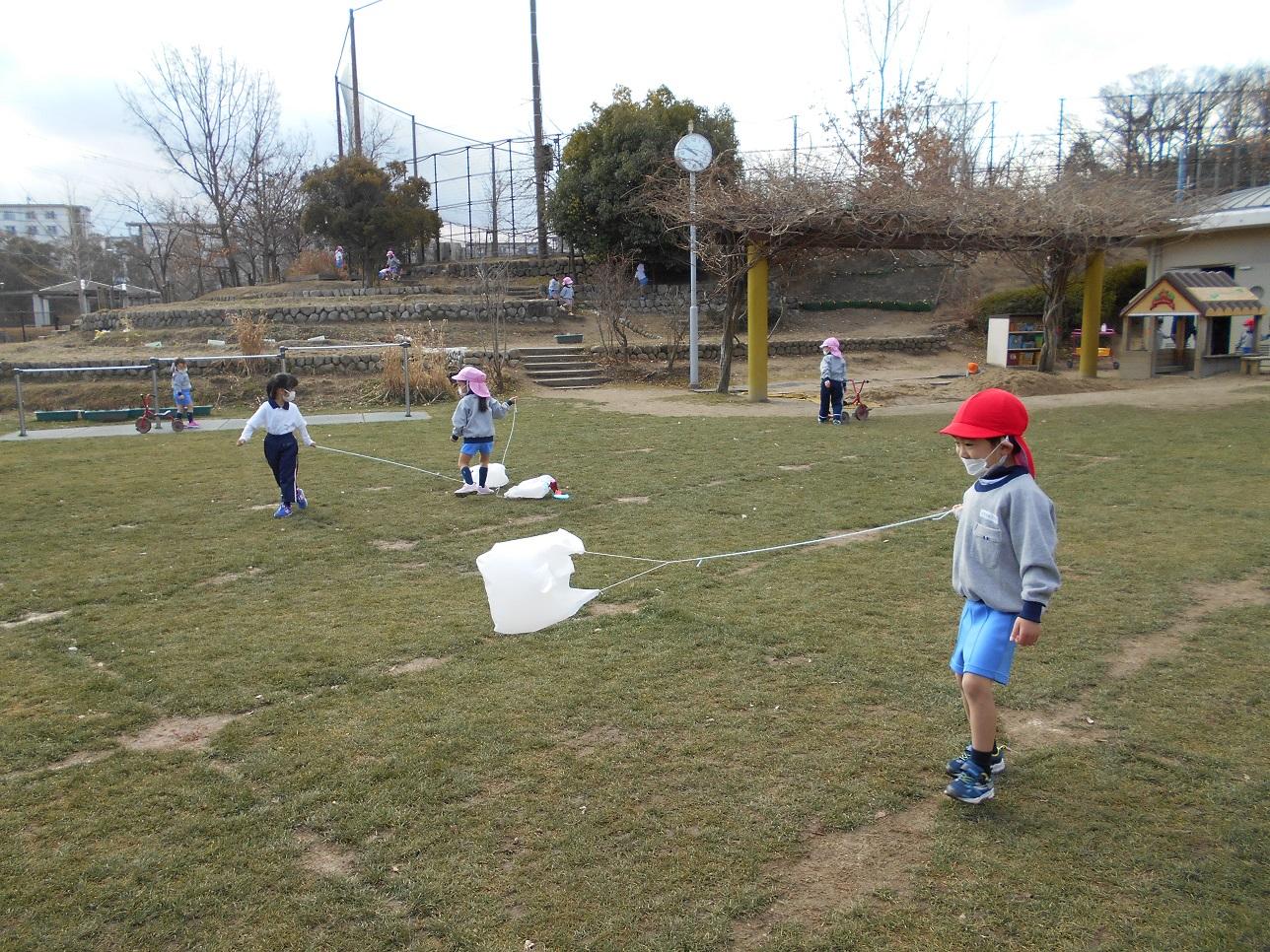 年少組の子ども達が、ビニールバッグで凧を作って凧揚げをしました。