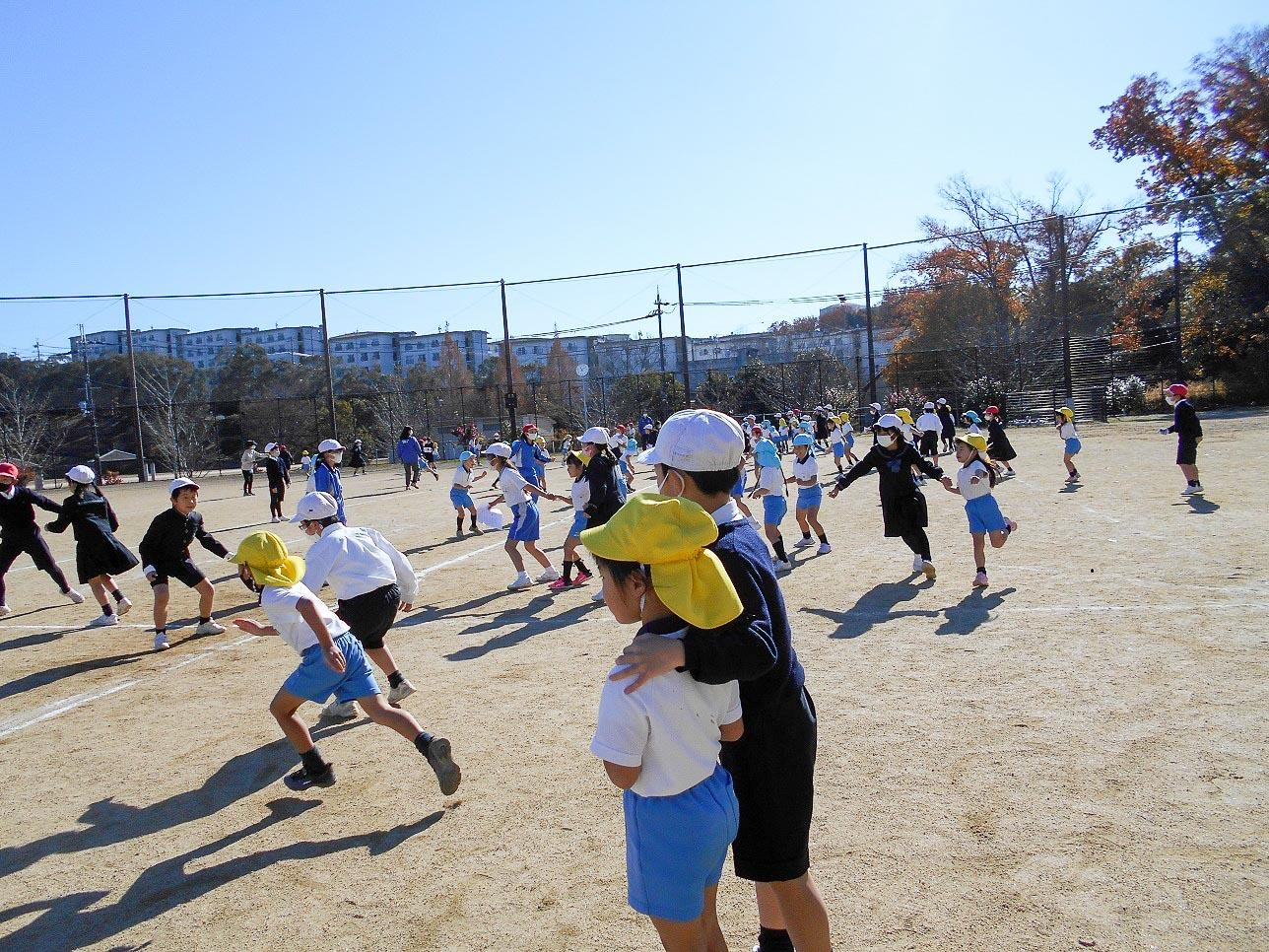 コロナでなかなかできなかった交流ですが、校庭で、楽しくゲーム遊びをしました。幼かった卒園児たちが、すっかりお兄ちゃんお姉ちゃんになって、まず幼稚園の園庭まで来てくれました。