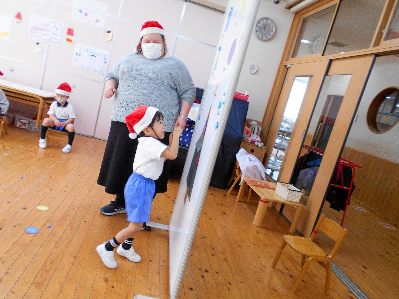 子ども達の大好きなサンタクロースの身体表現をして踊ったり、クリスマスツリーをホワイトボードに貼ったりしていきます。