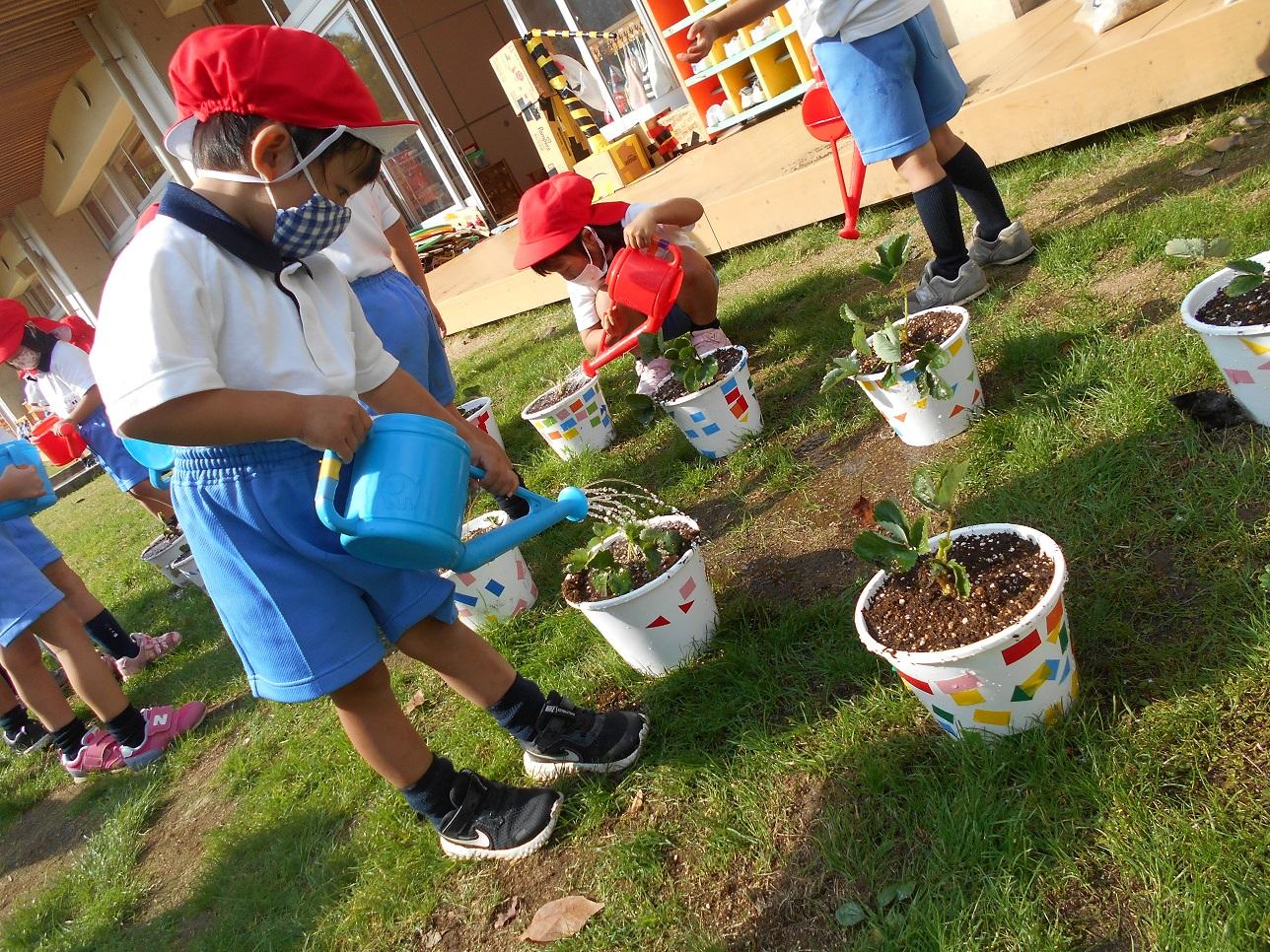 「これは、苺の苗といって、この真ん中から苺のあかちゃんが生まれてくるんだよ」と聞いて「そうかあ。まだねむってるんやなあ。」先生から「毎日お水をあげてお世話して下さいね」と言われて早速ジョウロを持ってきてお水やりをしていました。