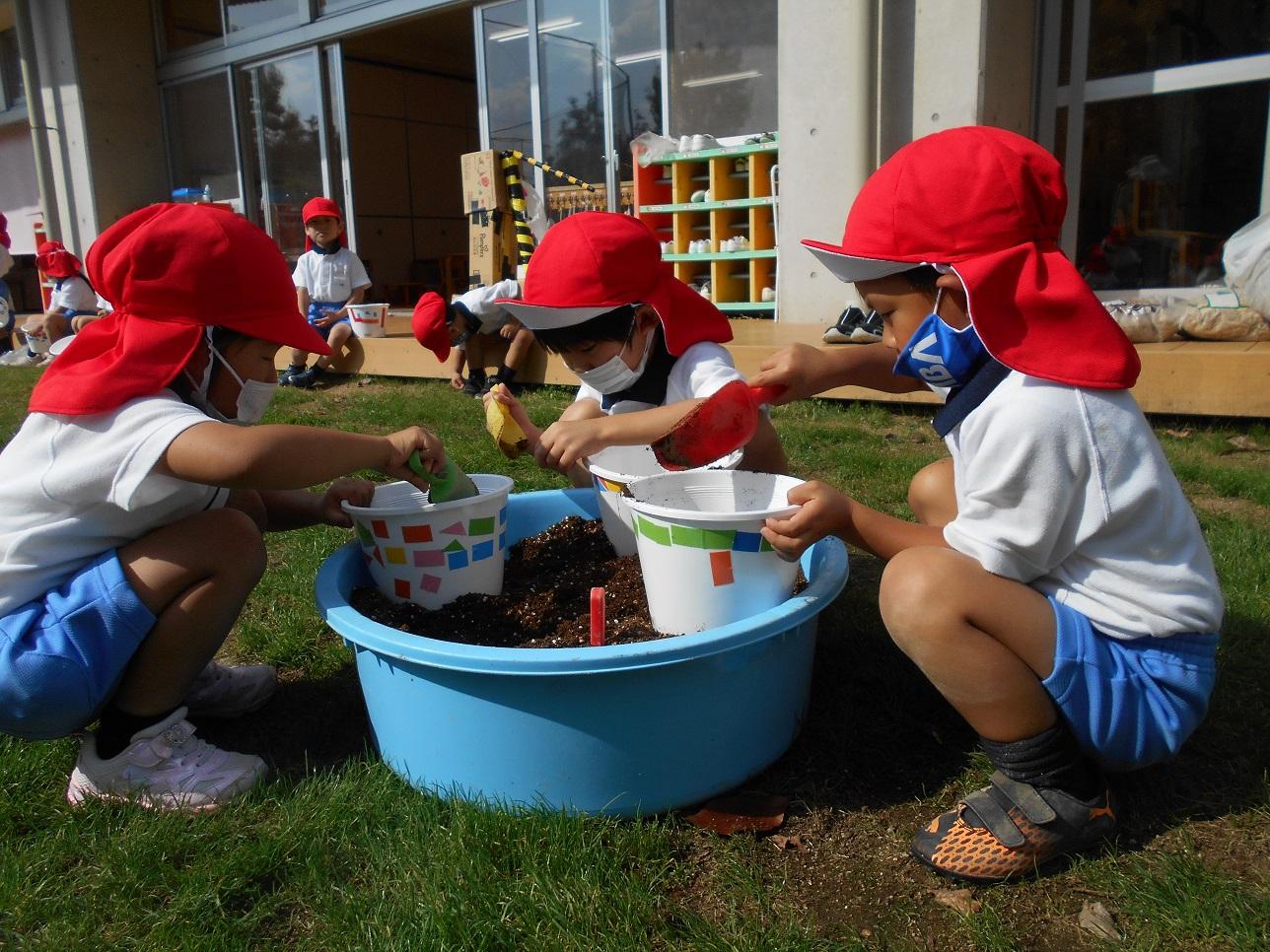年長組の子ども達は、初めから成長点は、どこにあるか先生に確かめながら、「そこは埋めたらダメだからねえ」と手伝いなしで植える事が出来ました。確かな体験となっていると思います。
