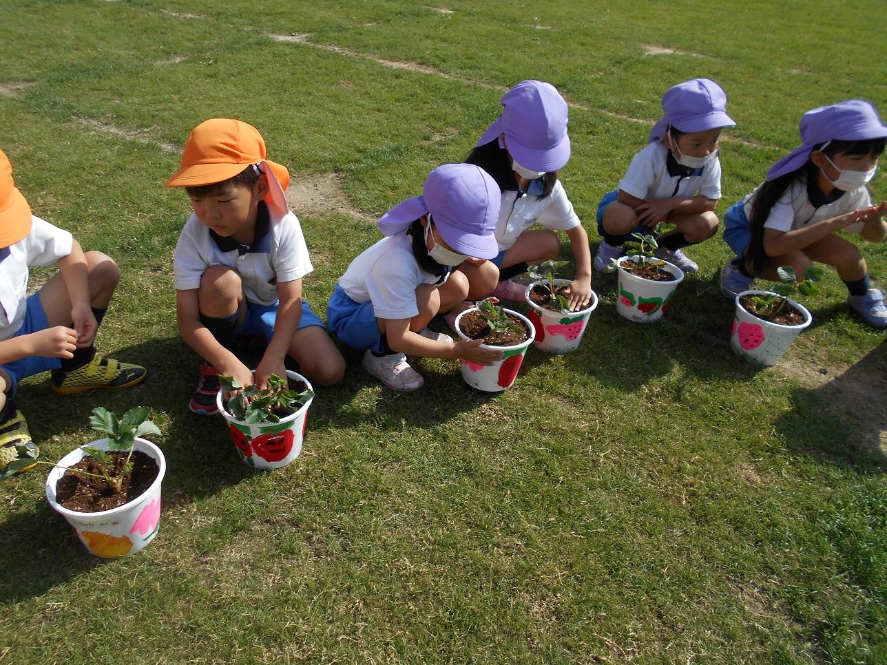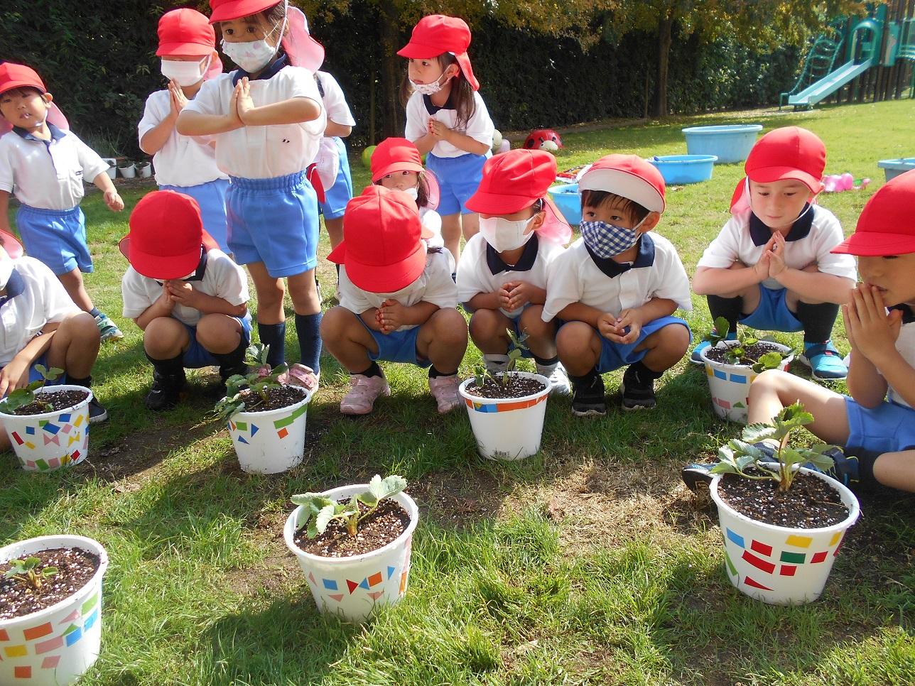 子ども達は、苺が大好きです。「さあ、苺を植えるよ~」と言う先生の話を聞いて、「どこにいちごがあるの?」と探す年少組の子ども達。