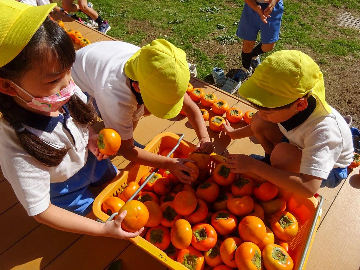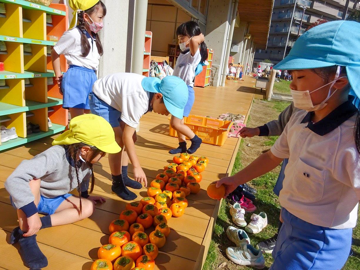 柿の個数を数えたり、それがいくつずつあげられるのかと考えたり、少しずつ算数に繋がっていく経験を共有しています。