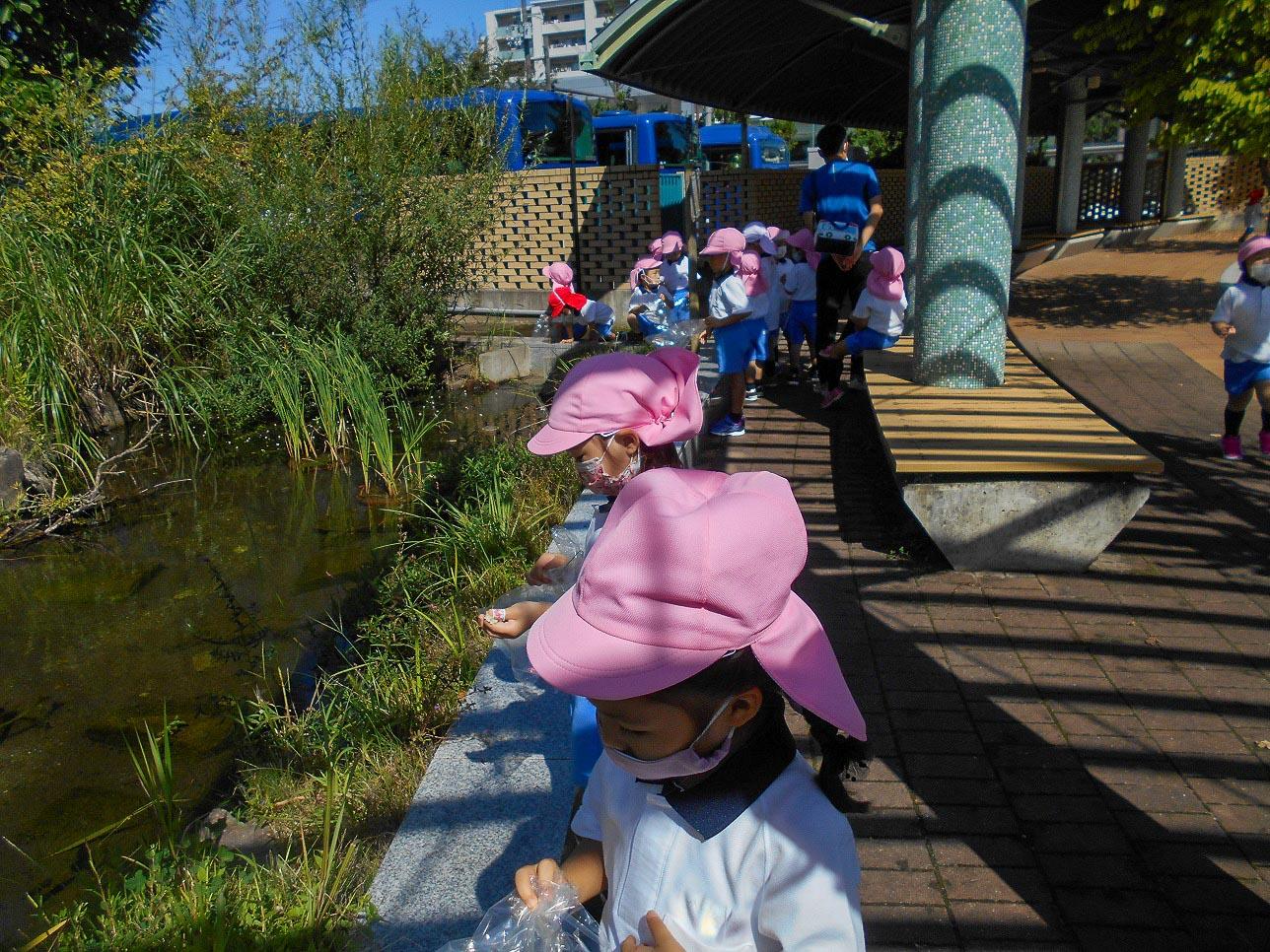 落ち葉や木の実を拾ったり、ビオトープを眺めたり、お散歩を楽しんでいます。