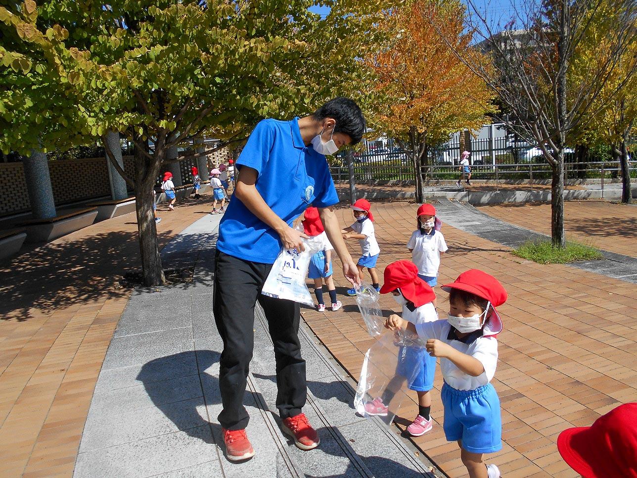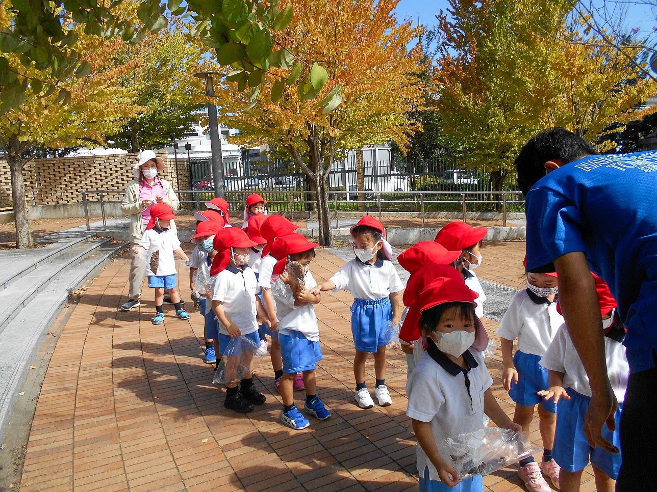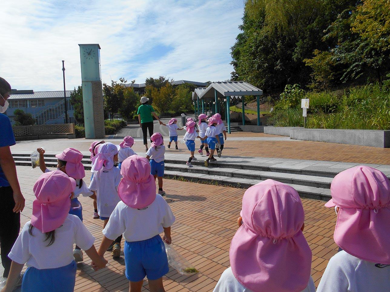 もうすぐ秋の遠足に行きます。年少組は、初めての遠足です。「並んでいけるかなあ」と幼稚園を出て学園のプロムナードへお散歩に出かけました。