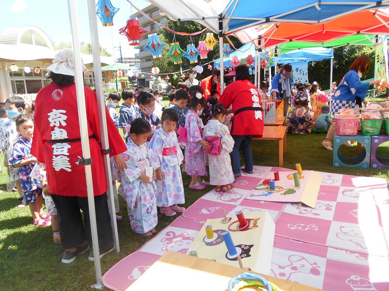 金魚すくい・ヨーヨー釣り・わなげ・おたのしみコーナーなど夏祭りさながらの屋台のように並んでいます。それぞれのコーナーでカードにスタンプを押してもらいます。登翔会様からいただいたお菓子のセットと遊んだ後のヨーヨーや金魚と楽しいシャボン玉スティックをおみやげにもらいました。