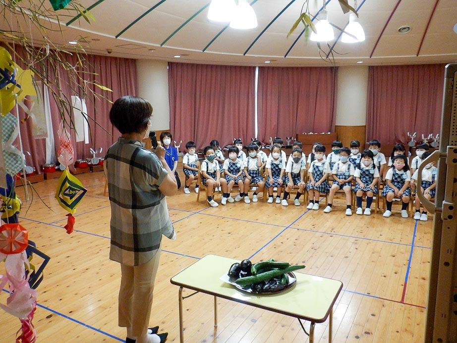 園では夏野菜(きゅうり・茄子・トマト・ピーマン)を育てているので、お星様にお供えしました。