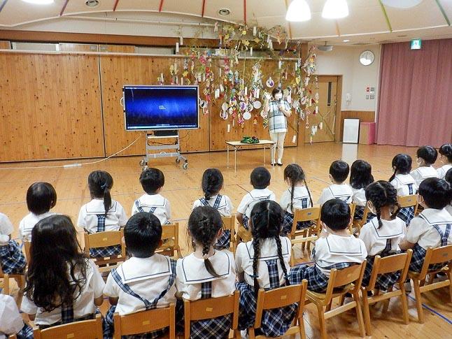 七夕様の織り姫星と彦星の話はDVDで鑑賞しましたが、「今日は、お星様が会えないかなあ」とか「雨でも会えるかなあ」と感想を言っていました。