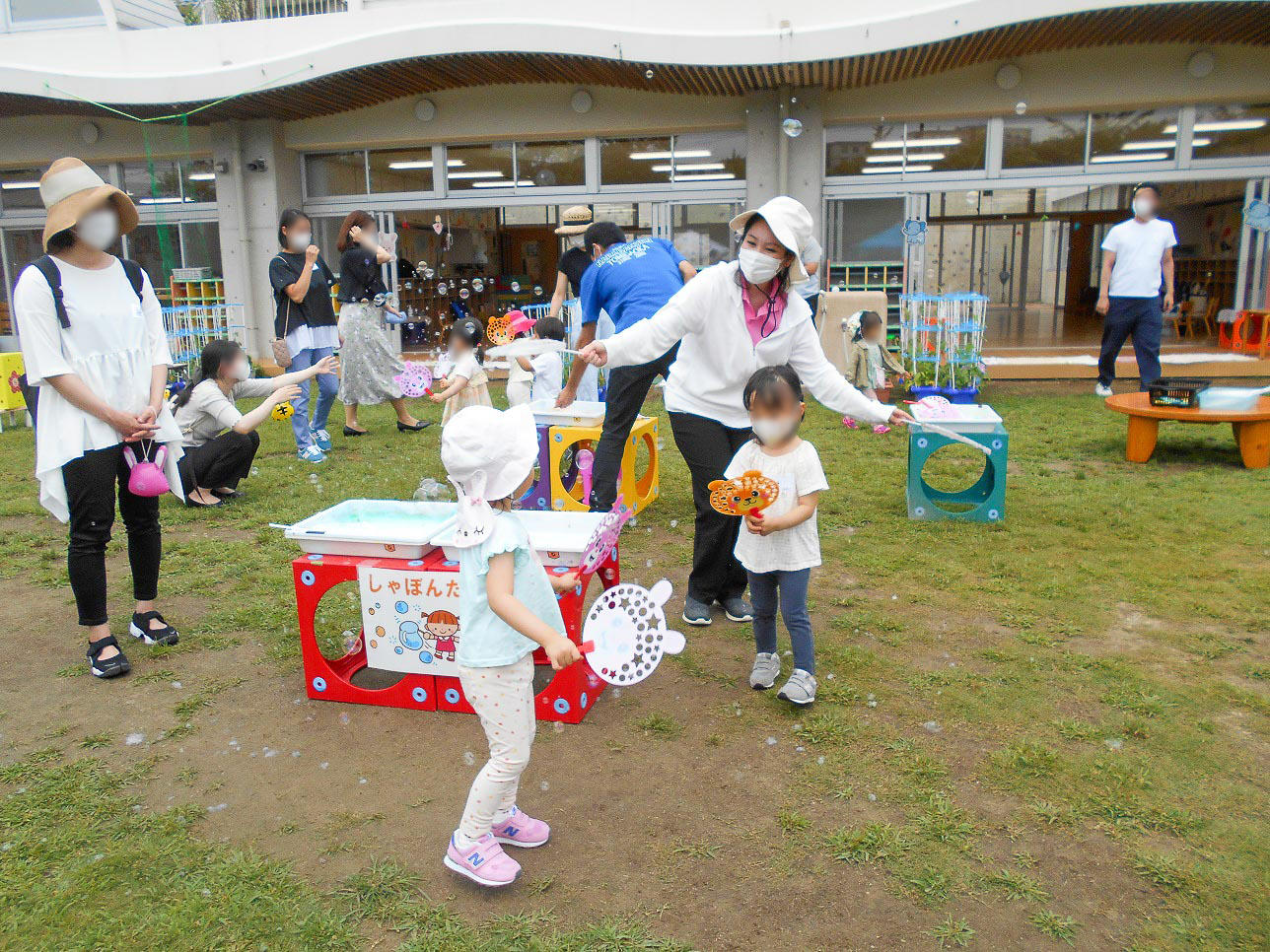 おうちの人と一緒に、シャボン玉スティックをもらって、いろいろなコーナーを巡ります。
