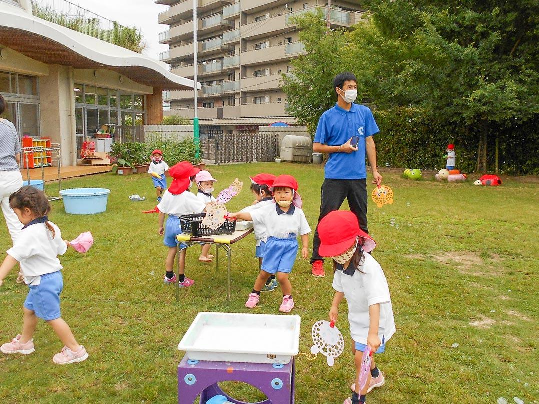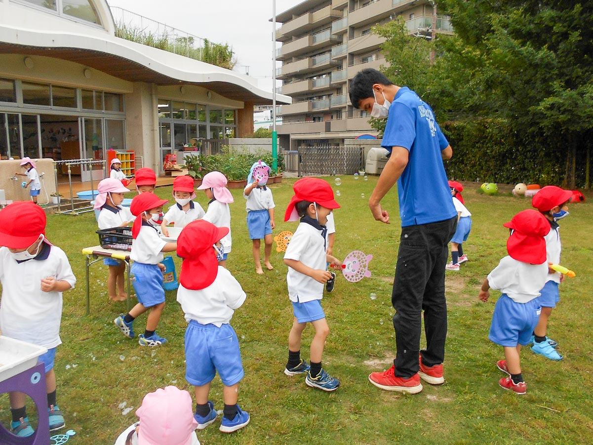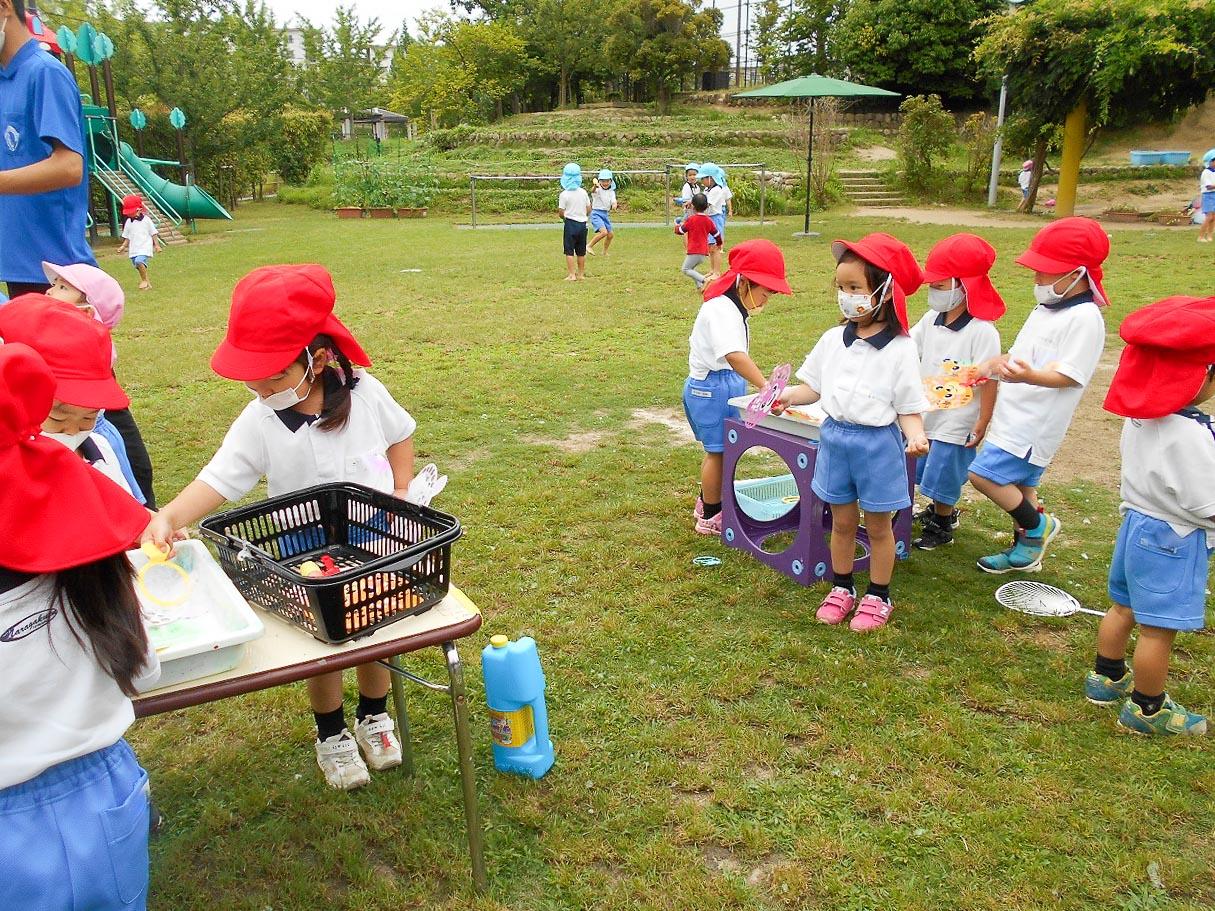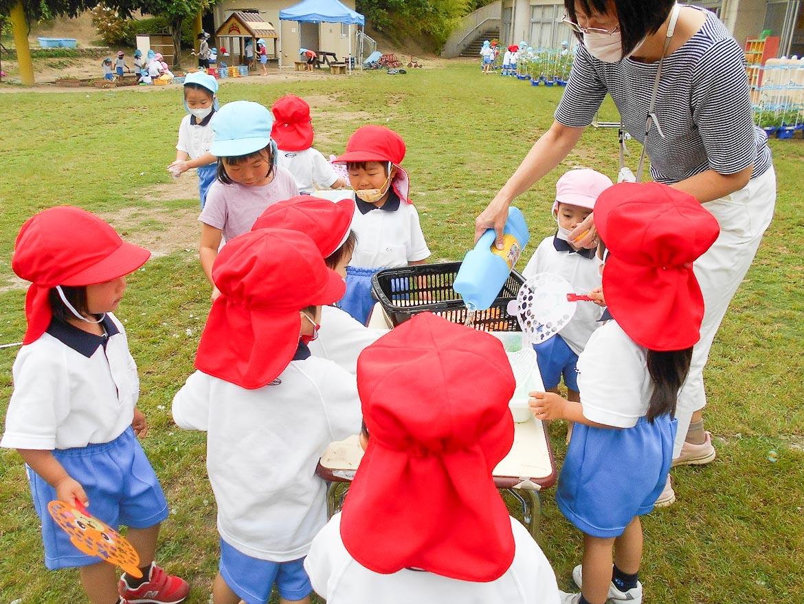 色水遊びでは、混色の不思議を体験して、シャボン玉では、どうしたら沢山シャボン玉がでるのかを工夫して、石けんでのアワアワ遊びでは、本当のソフトクリームみたいなアワを作ったりして、想像力と好奇心をふくらませました。