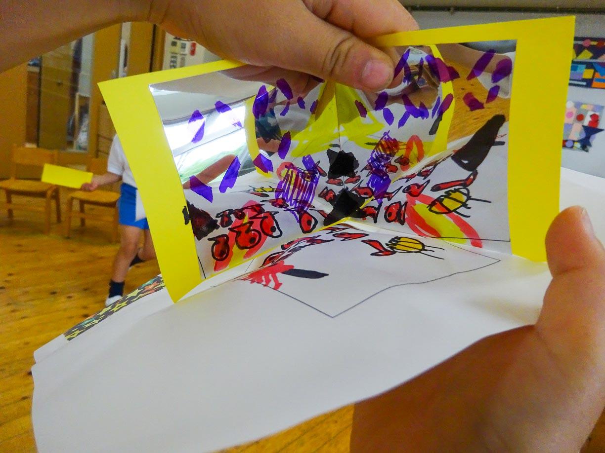 理科の先生は、二面に貼ったミラーにいろいろな模様を映すとどうなるか試してみようと言っていろいろな柄のシートを準備したり、自分で描けるようにマジックを準備したりして下さいました。二面の角度を変えるとミラーに映し出される形が変わっていきます。子ども達は、いろいろ自分で試しながら、鏡の不思議を体験しました。自分で試すことや自らやってみることは、子ども達の知的好奇心を沸き立たせます。目を輝かせて何度も何度も試していました。