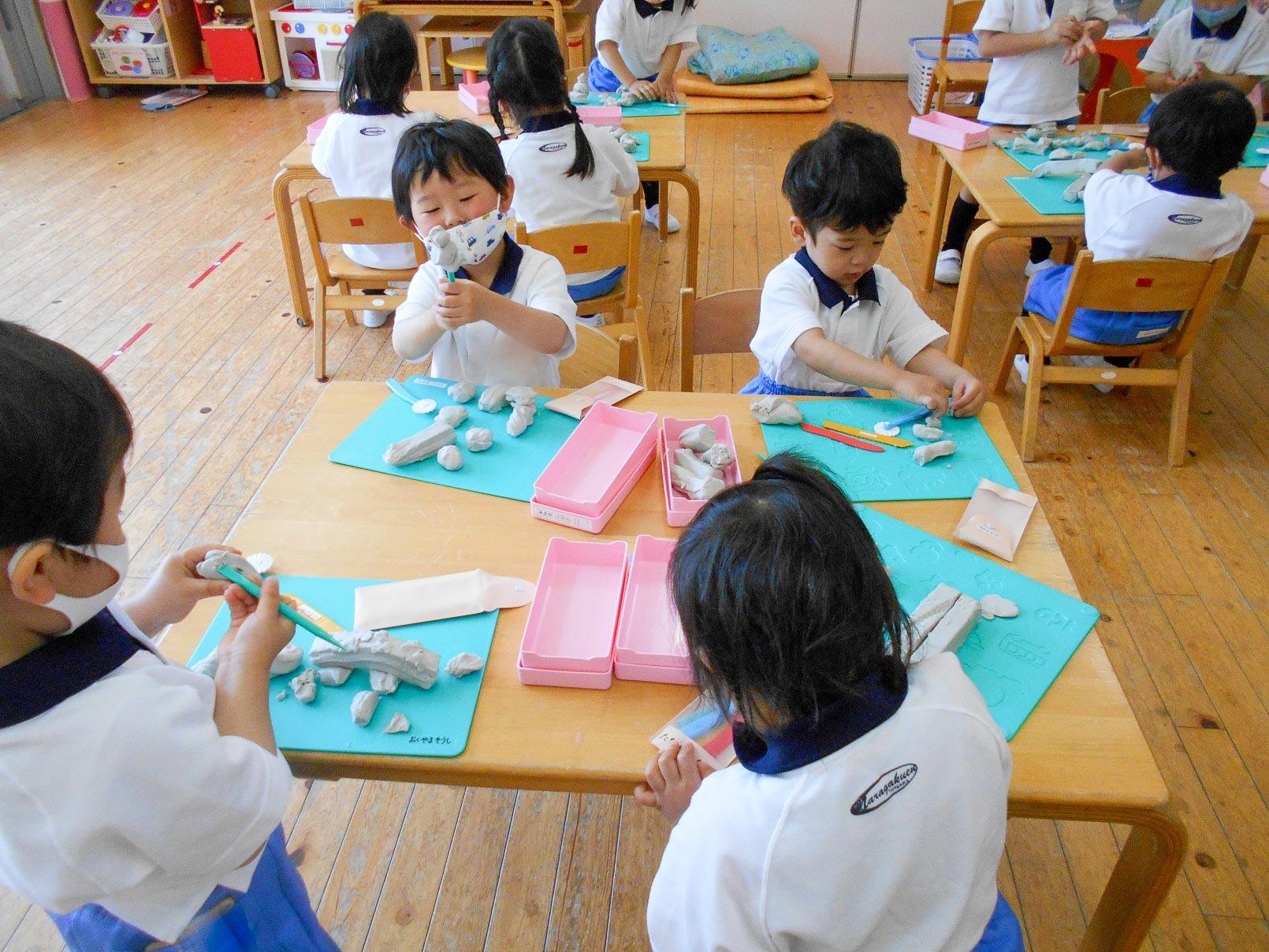 粘土遊びは、みんな大好きです。まだ、遊び方がわからなかったり力が無くて小さいものしか出来ない子もいますが、自分で作っていくのはとにかく楽しそうです。