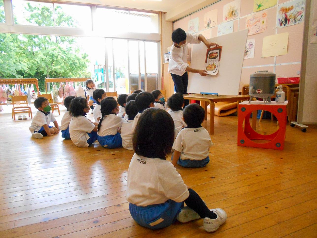 先生のパネルシアター「魔法の電子レンジ」を聞いて、みんなが出てきて欲しいお料理は?食べたいごちそうは?と言うことで、お絵かきが始まりました。