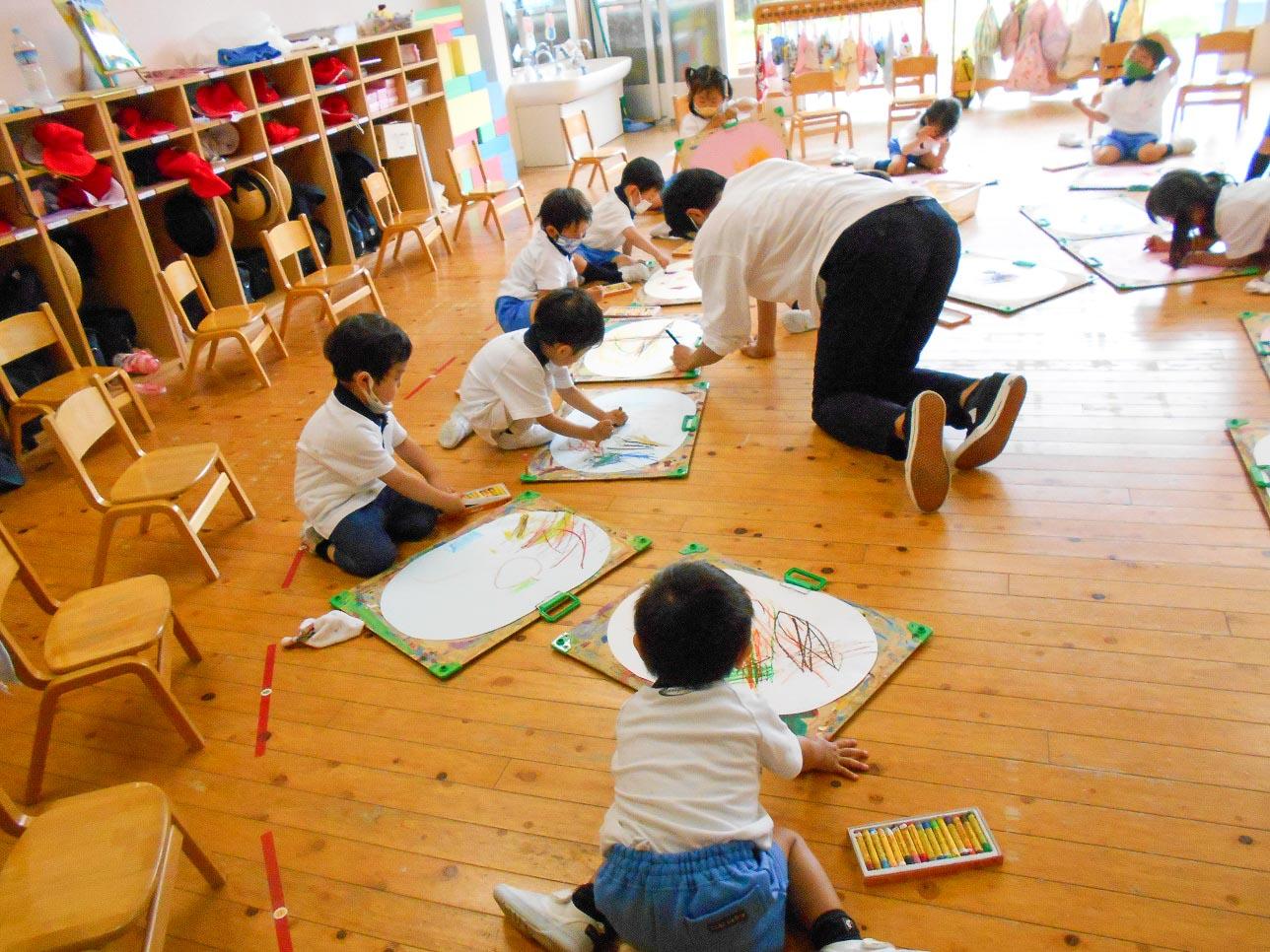 自分の思ったようにはなかなか描けませんが、描きながら、いろいろ想像して、お話もします。自分の思うように描けるようになるまで、何回も何回も描く機会を作って、自由にのびのびと表現出来るようになって欲しいと思います。