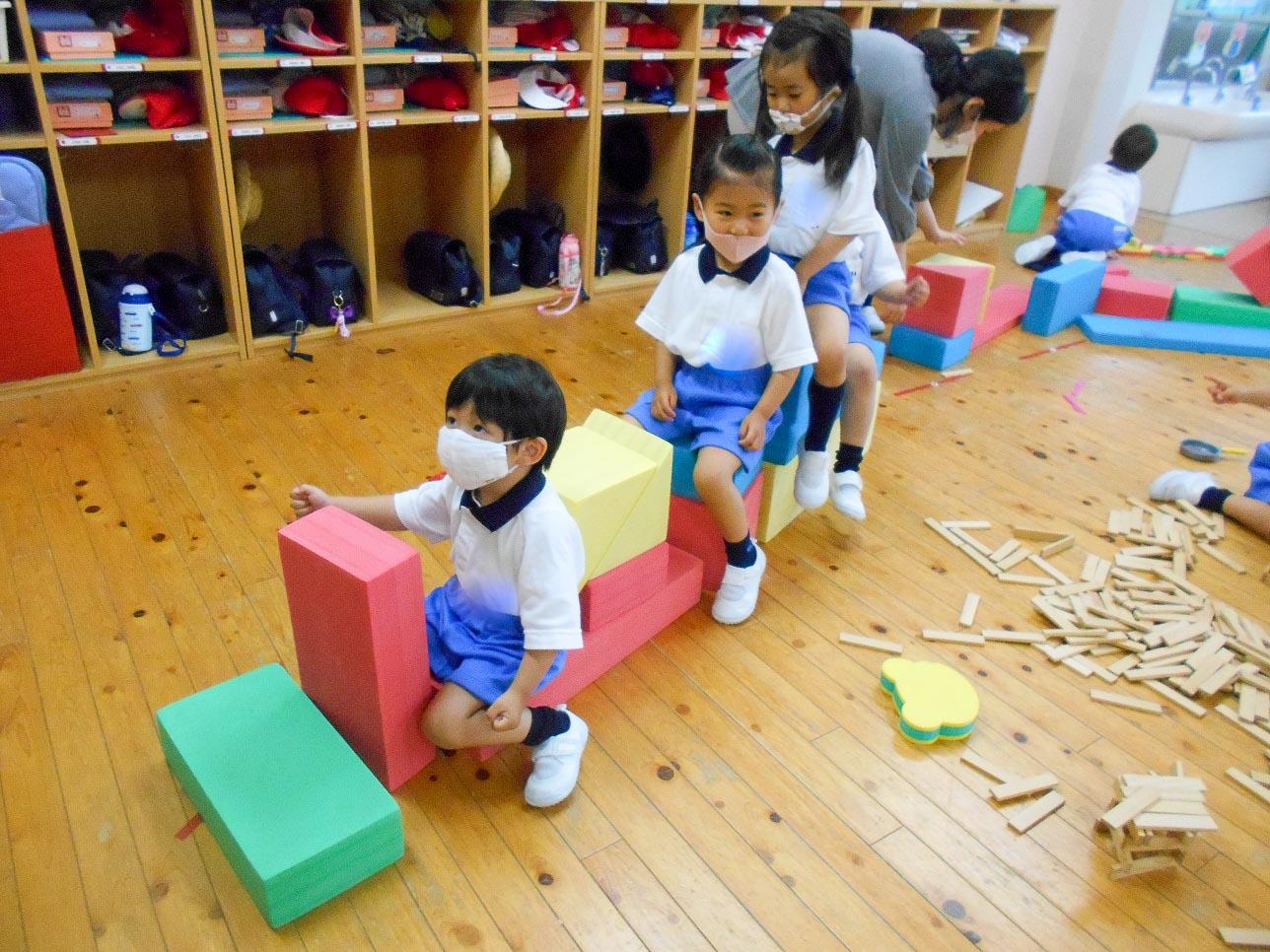 まだまだ、一人遊びの延長ですが、「い~れ~て」と言う言葉も聞こえてきます。それぞれに好きな遊びをしているのですが、なんだか楽しそうだなと思ったら側によって遊び始めます。そのうちおもちゃの取り合いや友達の取り合いや意見の食い違いで喧嘩になったりもしますが、それもこの幼児期の学びです。何度もトラブルを経験しながら、自分の思いと相手の思いの折り合いをつけるようになります。ぶつかり合いの無いままでは、相手の気持ちを知ることはなかなか出来ません。もしかしたらまだ、自分の思いを言えないままで、おうちに帰っているかもしれません。おうちでなら話せるかもしれません。幼稚園と家庭と丁寧に話しをして、信頼関係を作って行きたいと思います。