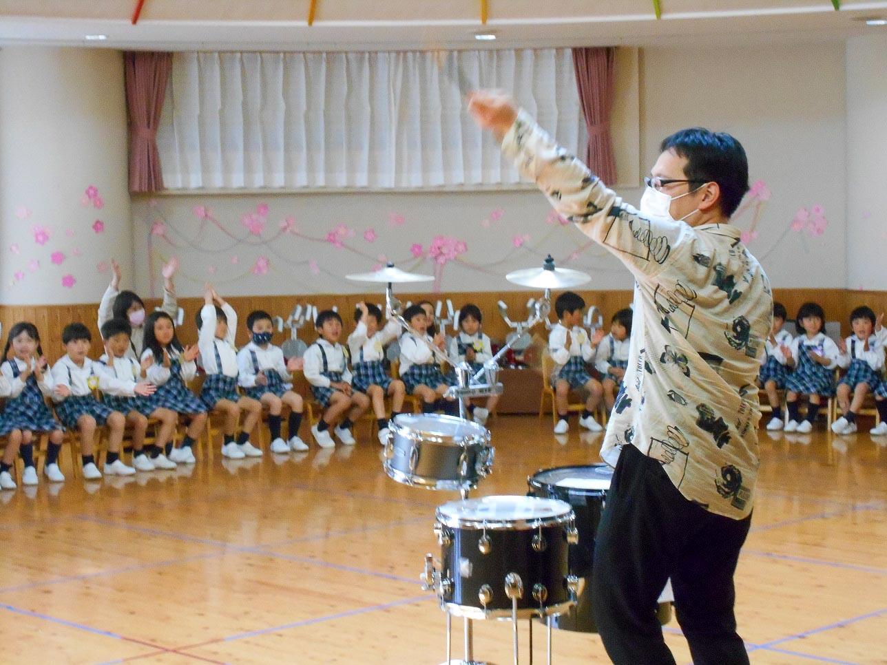 県警の音楽隊でドラムをされている保護者の方がいらして、マーチングをする子ども達に聴かせてあげたいと演奏しに来て下さいました。