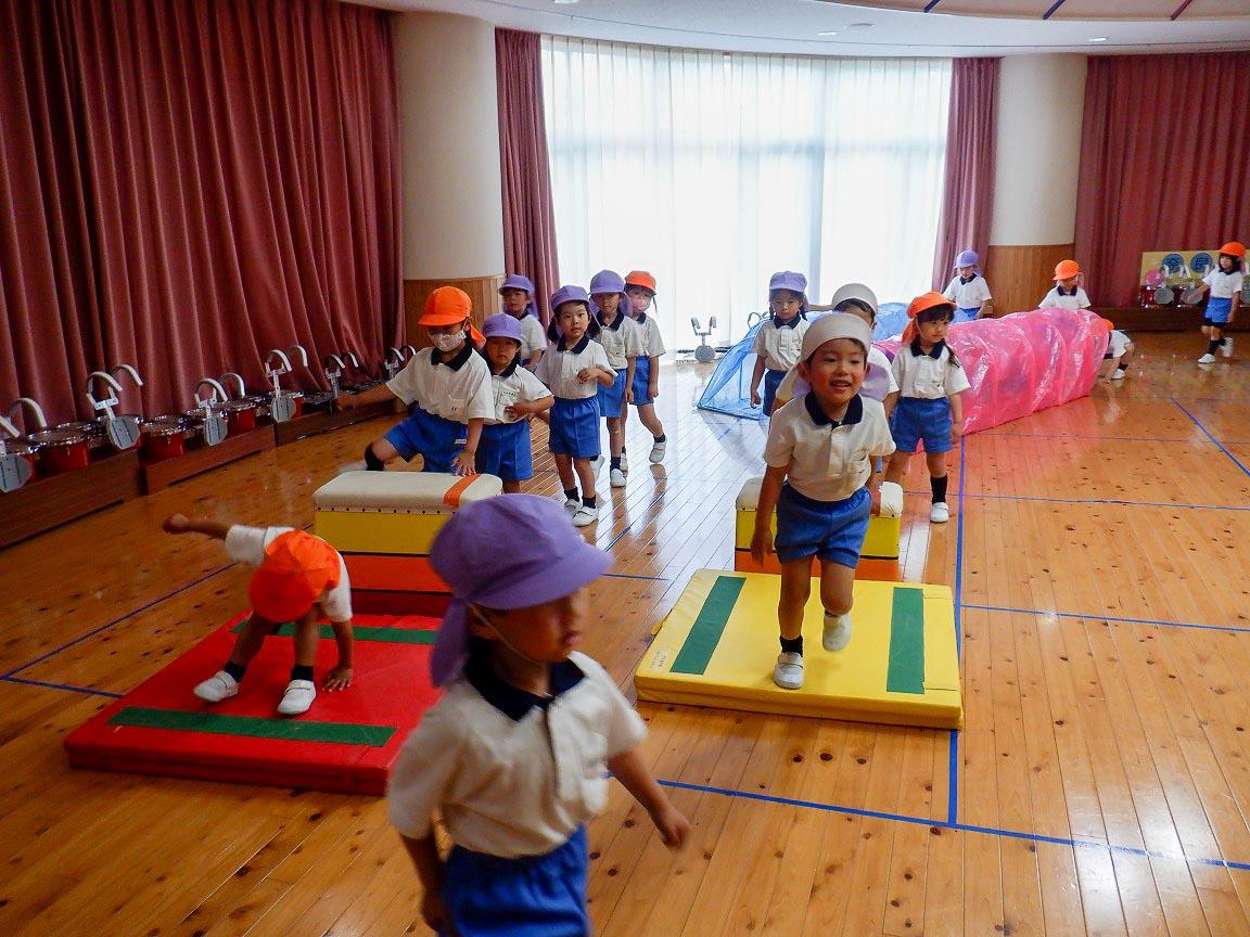 トンネルをくぐったり、跳び箱から跳んだり、一本橋を渡ったり、フープをぴょんぴょん跳んだり、