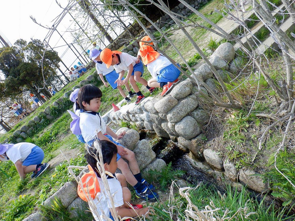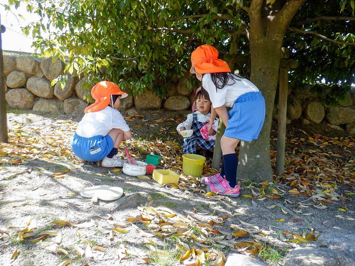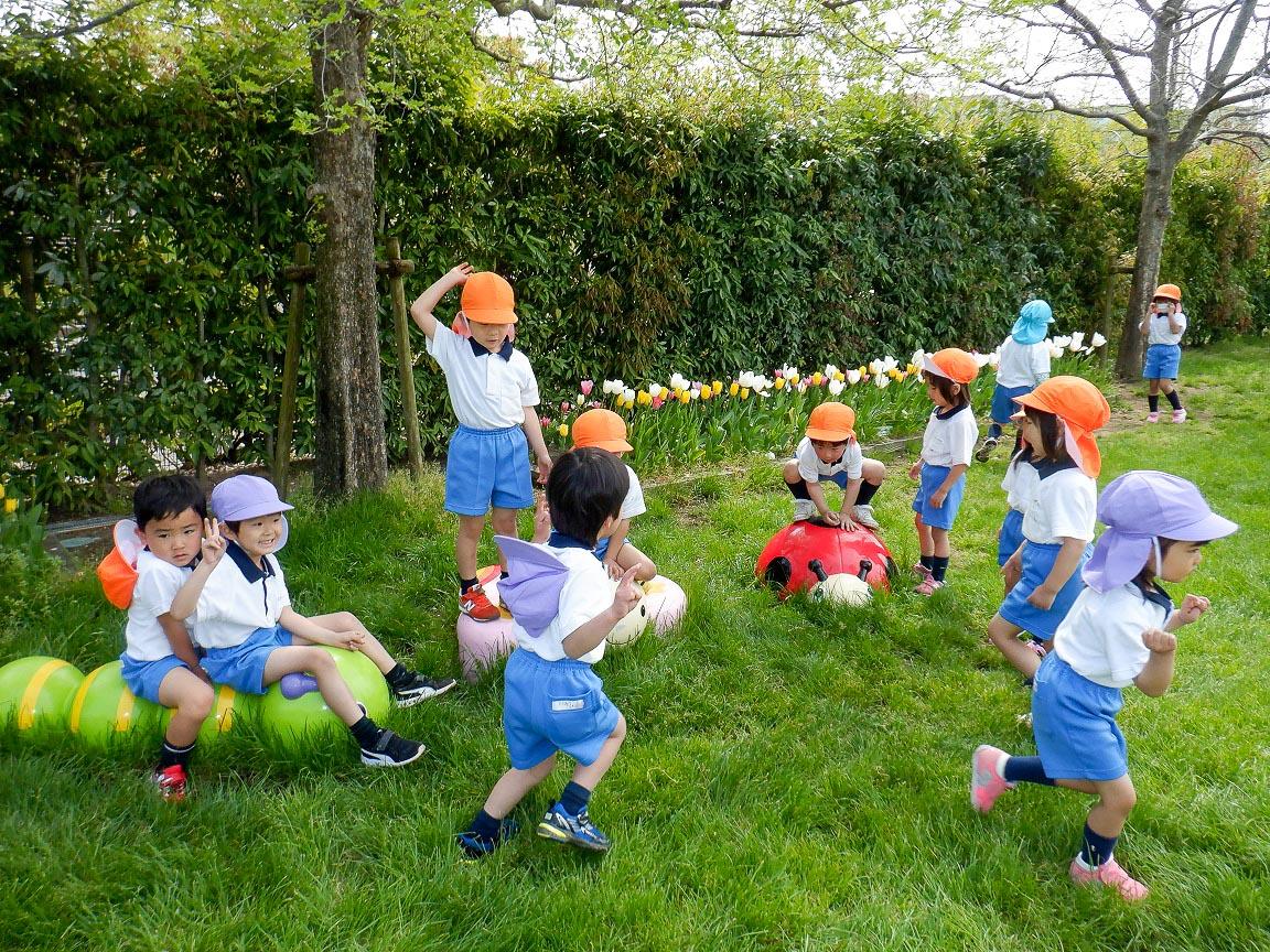 幼稚園にもすっかり慣れて、気の合う仲良しの友達と自分で行きたいところへ行き、自分のしたい遊びをしています。自然を満喫しながら、友達と協同の遊びを楽しんだり、発見したりとアクティブラーニングの始まりです。