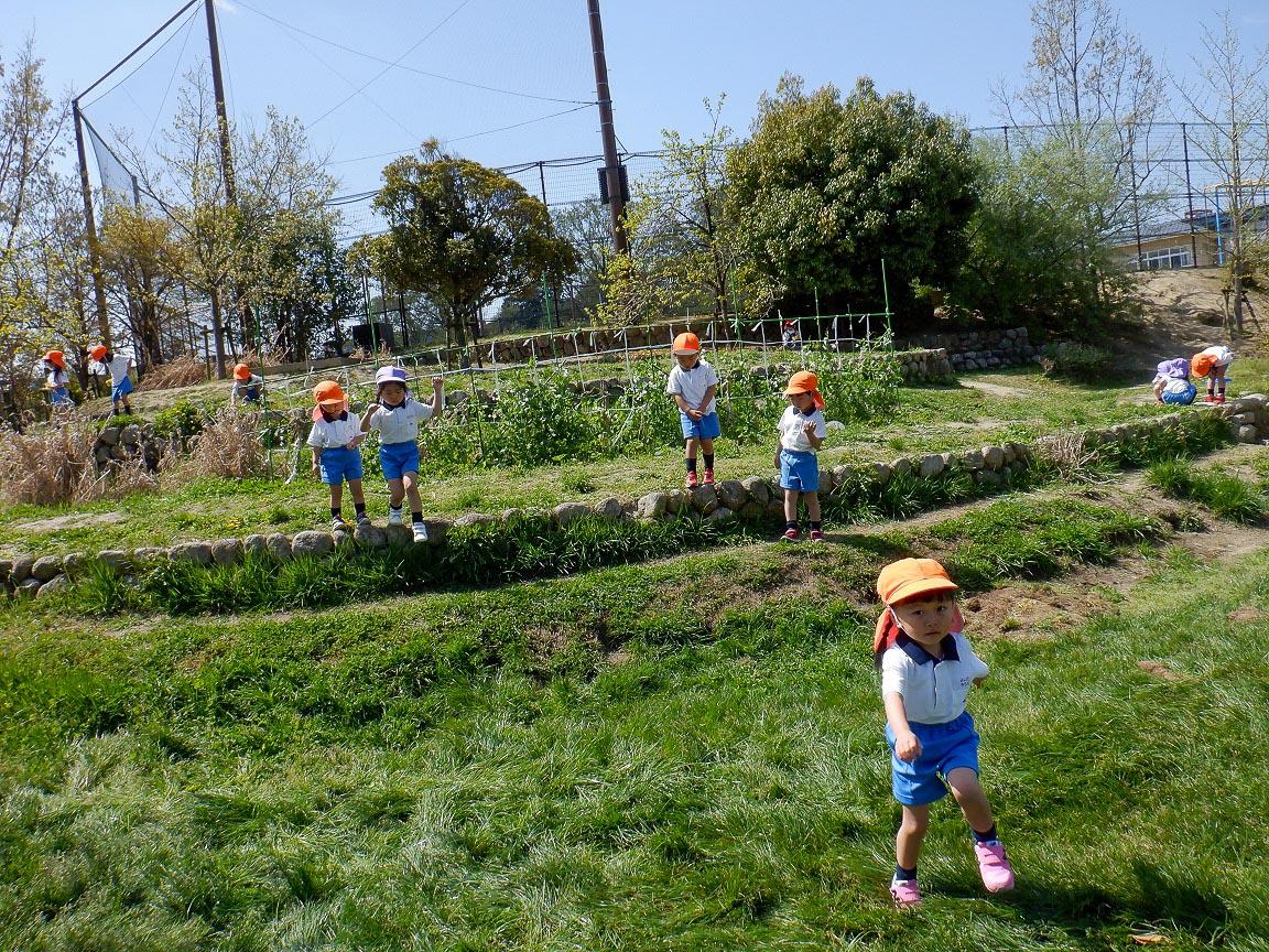 進級児達は、新しいクラスになっても、園庭や棚田では年少の時の友達関係が続きます。見ていると元のクラスの友達と遊んでいます。