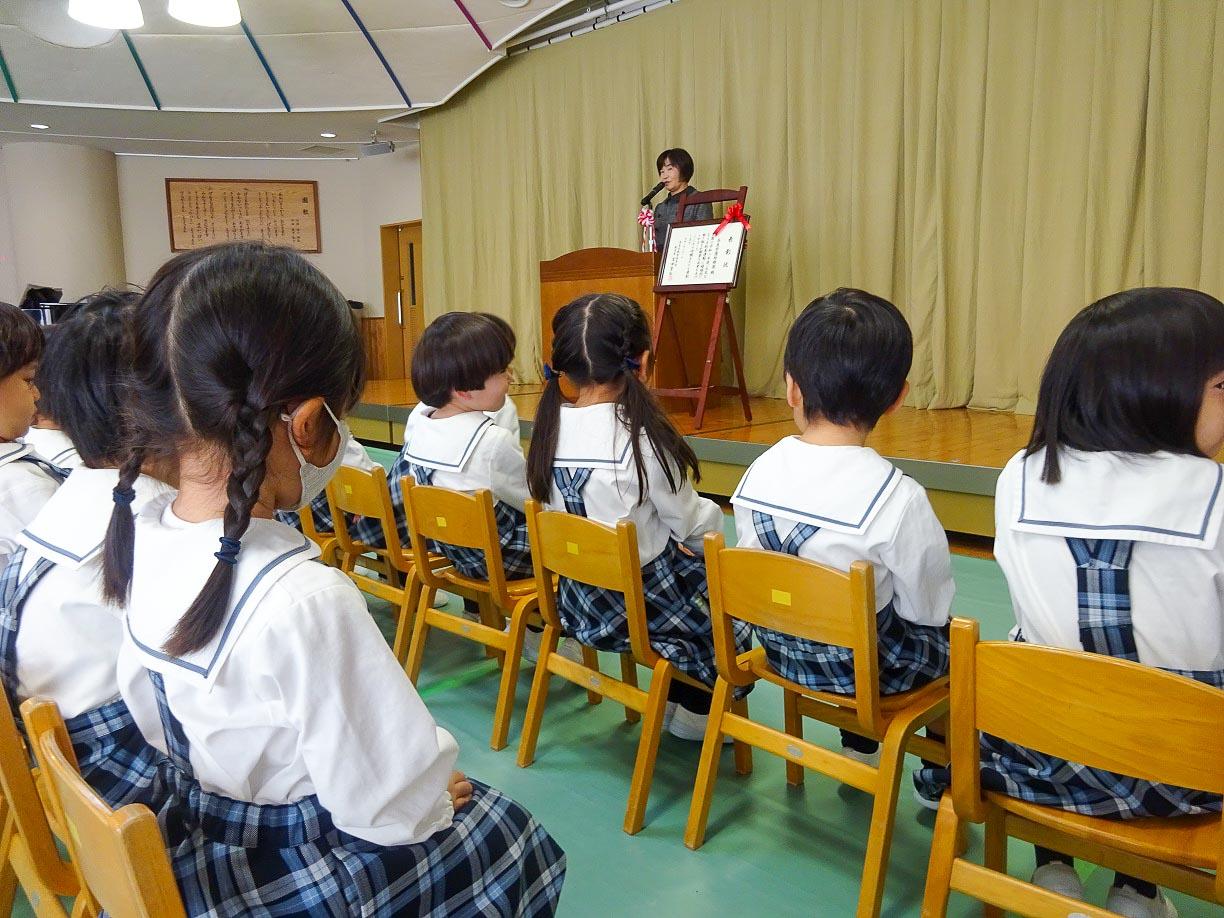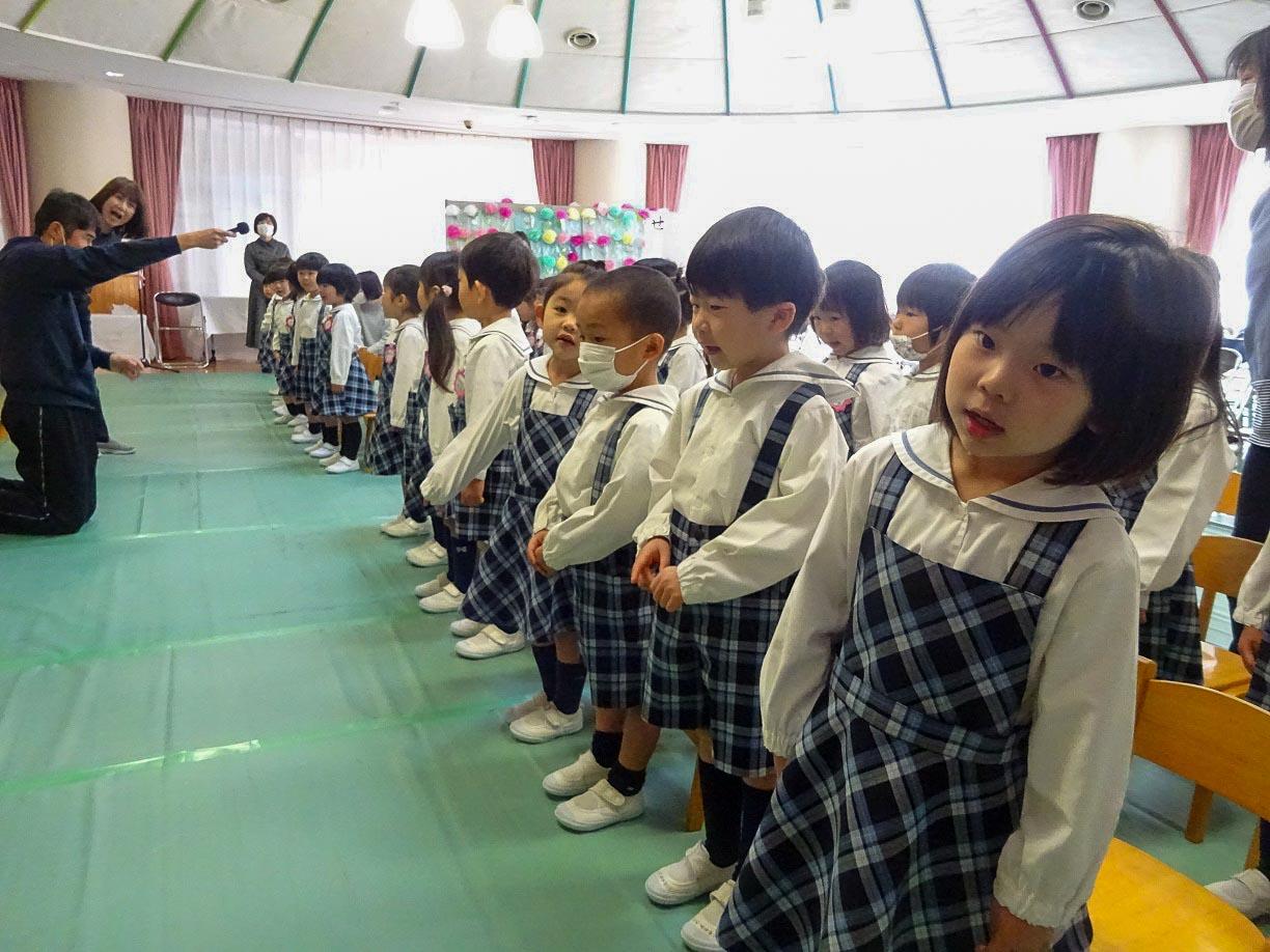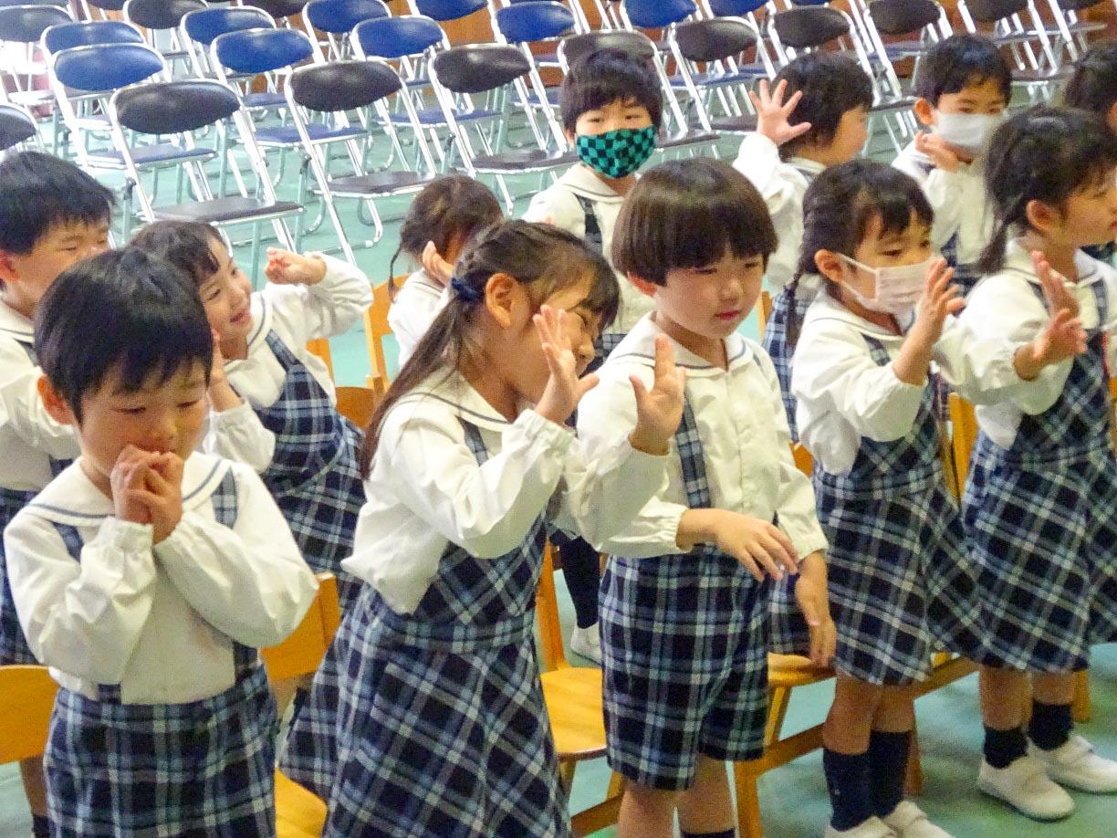 年中組は、今度は年長組になるという自覚が感じられ、とても姿勢良く座れていました。一人一人しっかり話を聞いて綺麗な声で♪はるですよ♪と園歌を歌いました。春休み中にしっかり年長組になっておく約束をしました。