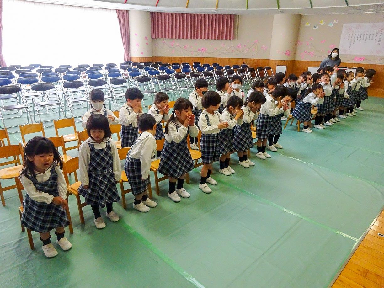 年少組は、卒園式の練習に何度か参加したことで、少しピリッとした感じで座っていました。「起立・礼・着席」もちゃんと出来ました。年少組から年中組になるという意味もよくわかっていました。可愛い手振りをつけて♪はるののはらにつくしんぼ♪と園歌を歌いました。すっかり春になったと皆が感じているようでした。