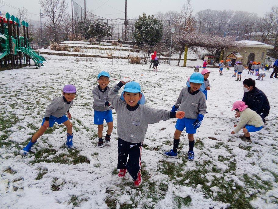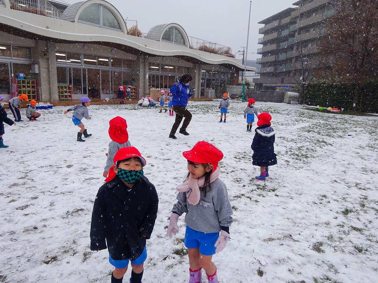 子ども達は大喜びで園庭にでて、走り回りました。牡丹雪がしんしんと降り続きましたが、子ども達は、降る雪にもかまわず雪を集めたり、雪合戦をしたり存分に雪遊びを楽しみました。芝生に積もった雪は、まっしろでとても綺麗でしたが、どろんこになった雪もありました。