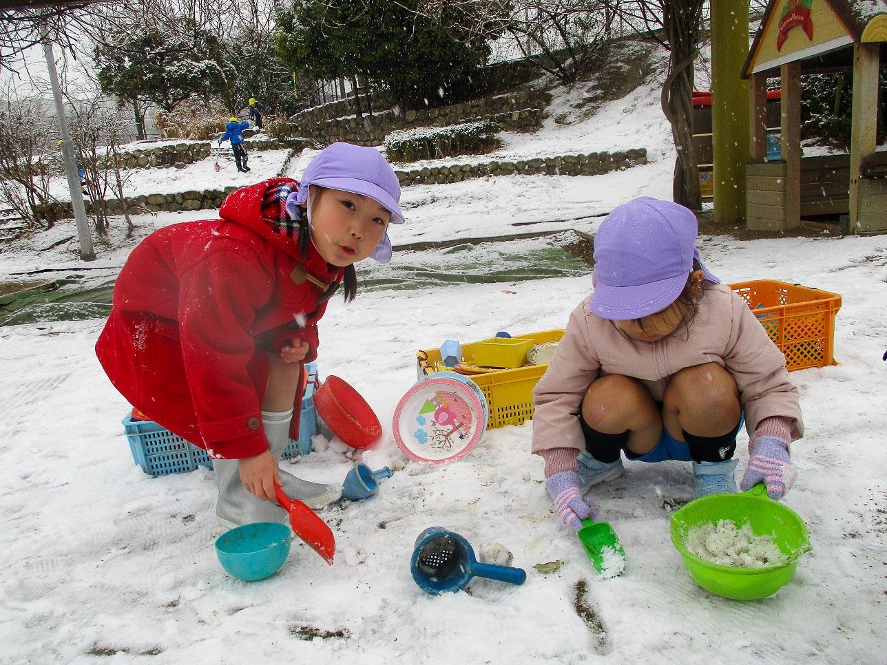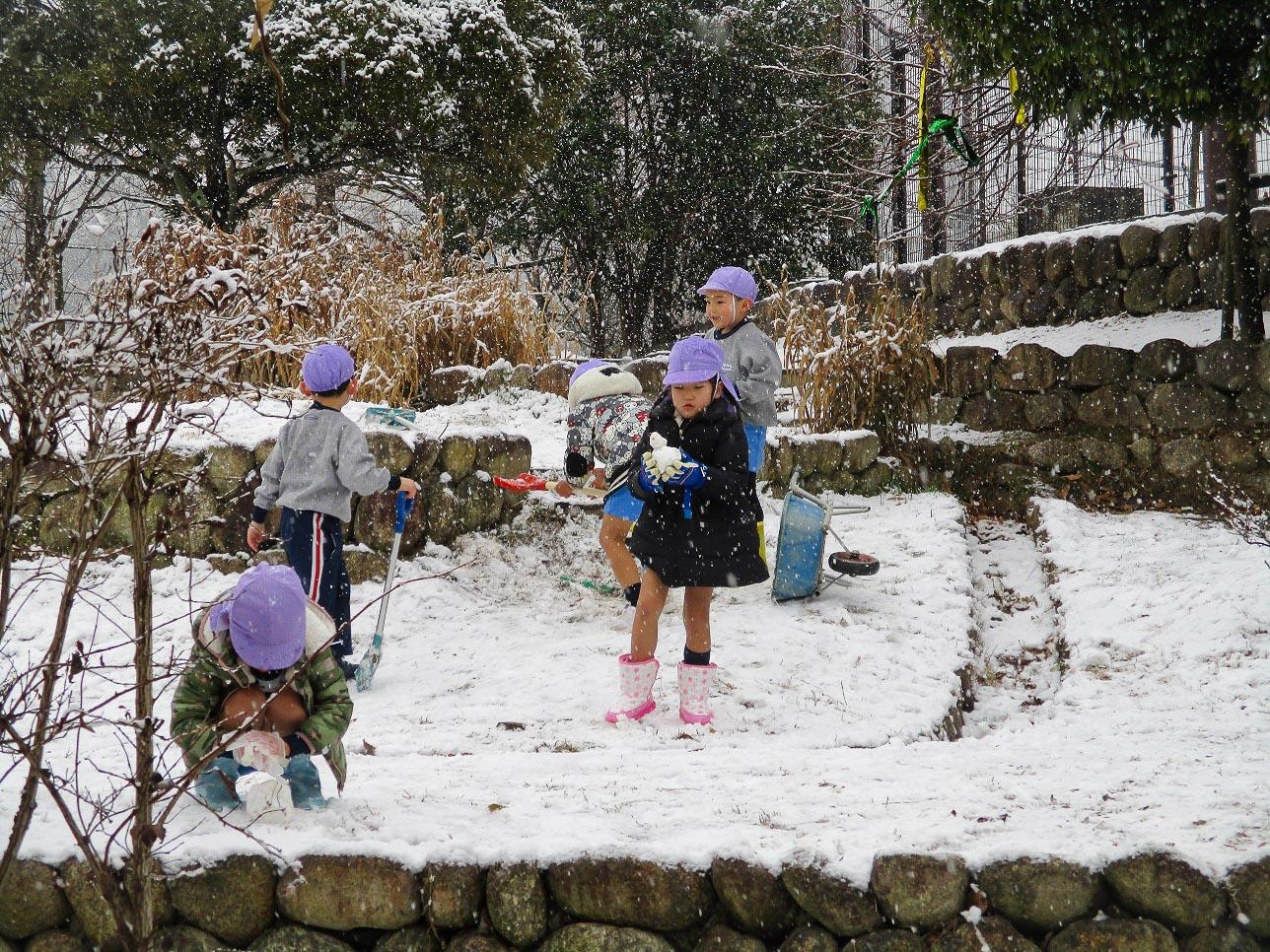 子ども達は、珍しい雪に目を輝かせて、おおはしゃぎです。子ども達の好奇心は、どんどん高まります。自然の不思議を発見、寒さなんてなんのそのです。