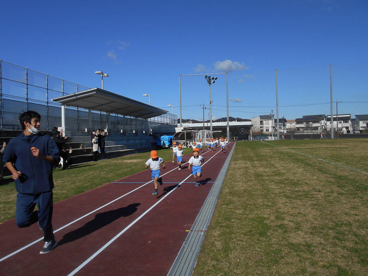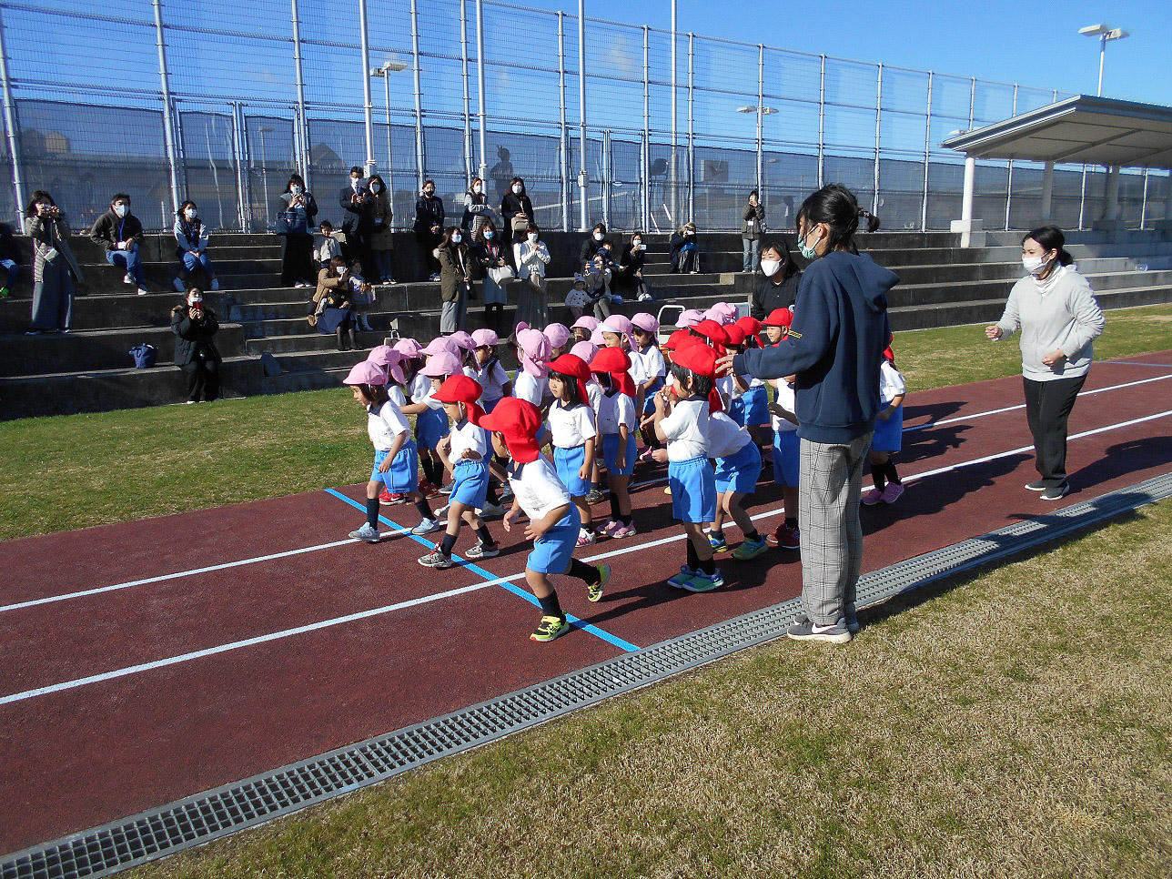 早い子と最後の子では、随分距離が開いたので、年少の子ども達は最後の子どもを向かえに走り出し、一緒にもう一度走ってしまうという微笑ましい姿もありました。