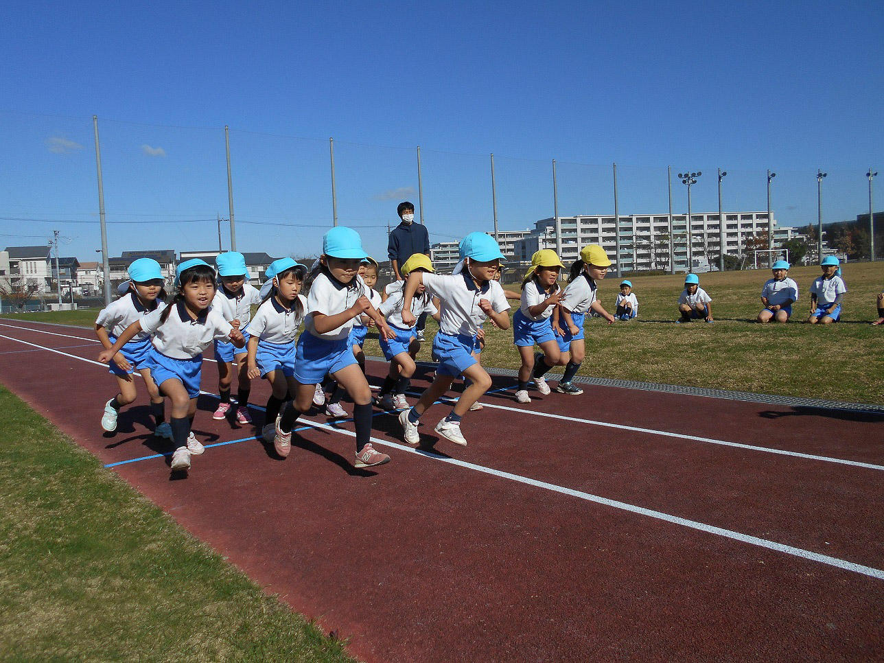 総合グランドの赤いタータントラックを年少は、1周・年中は1周半、年長は2周しました。日頃から走って鍛えている力を発揮出来ました。