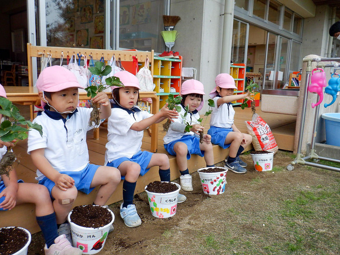 年少組は、苺を植えると聞いて苗を手に取ると「あれ?苺って・・・どこにあるの?」と不思議そうに見ています。「苺の赤ちゃんは、まだこの葉っぱと根っこの間で眠っているんだよ」というと不思議そうに見ていました。