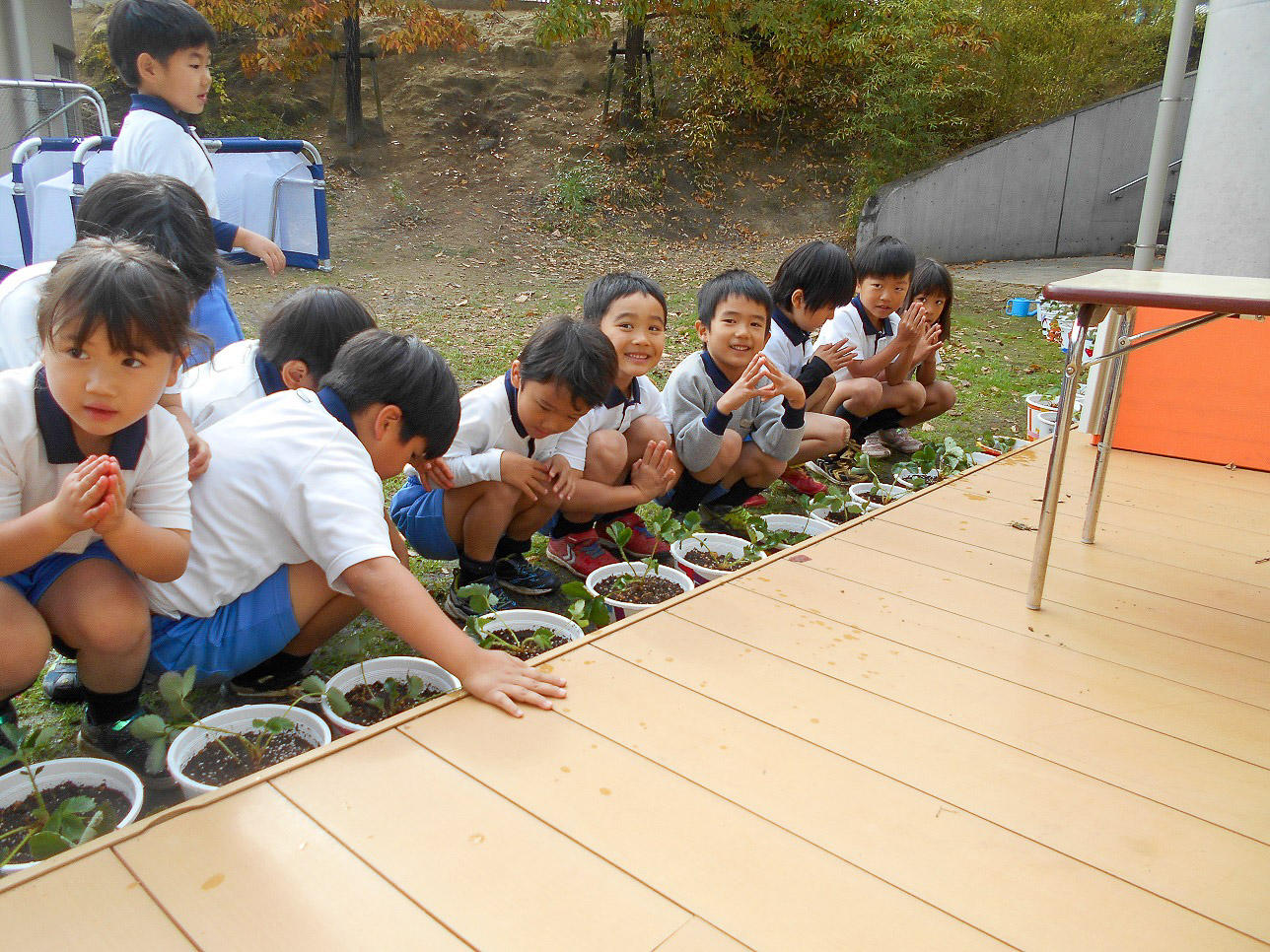 それぞれ自分の鉢に可愛い模様をつけたり描いたりしてから、今年もいちごの苗を自分の鉢に植えました。これは、今年の春に実った後、ランナーを子どもの株・孫の株と増えていって育った苗です。